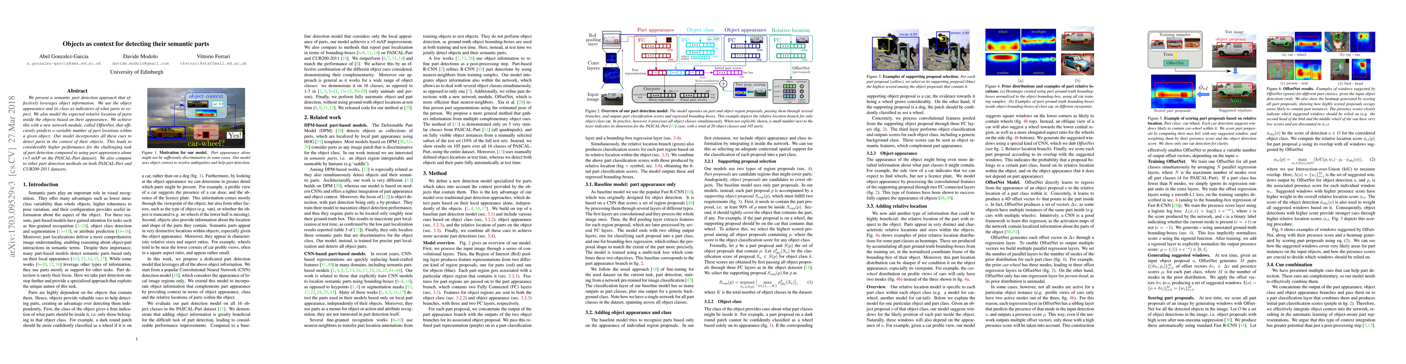 This paper introduces OffsetNet, a new network module that uses object appearance and class information to predict the relative location of semantic parts within objects, significantly improving part detection performance (+5 mAP on PASCAL-Part) compared to methods relying solely on part appearance. The approach is validated on PASCAL-Part and CUB200-2011 datasets.