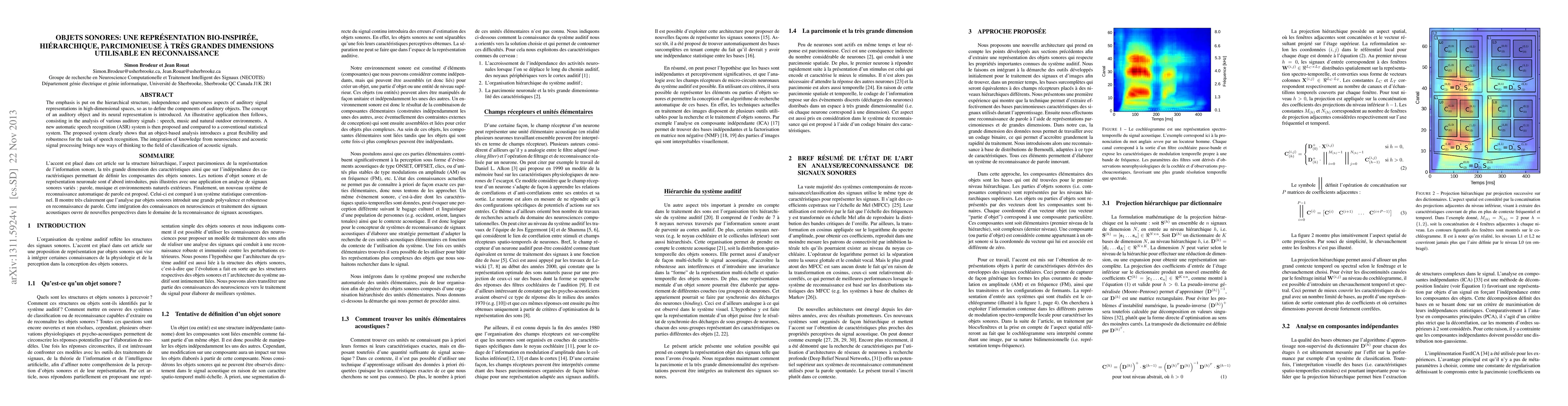 L'accent est plac\'e dans cet article sur la structure hi\'erarchique, l'aspect parcimonieux de la repr\'esentation de l'information sonore, la tr\`es grande dimension des caract\'eristiques ainsi que sur l'ind\'ependance des caract\'eristiques permettant de d\'efinir les composantes des objets sonores. Les notions d'objet sonore et de repr\'esentation neuronale sont d'abord introduites, puis illustr\'ees avec une application en analyse de signaux sonores vari\'es: parole, musique et environnements naturels ext\'erieurs. Finalement, un nouveau syst\`eme de reconnaissance automatique de parole est propos\'e. Celui-ci est compar\'e \`a un syst\`eme statistique conventionnel. Il montre tr\`es clairement que l'analyse par objets sonores introduit une grande polyvalence et robustesse en reconnaissance de parole. Cette int\'egration des connaissances en neurosciences et traitement des signaux acoustiques ouvre de nouvelles perspectives dans le domaine de la reconnaissance de signaux acoustiques. The emphasis is put on the hierarchical structure, independence and sparseness aspects of auditory signal representations in high-dimensional spaces, so as to define the components of auditory objects. The concept of an auditory object and its neural representation is introduced. An illustrative application then follows, consisting in the analysis of various auditory signals: speech, music and natural outdoor environments. A new automatic speech recognition (ASR) system is then proposed and compared to a conventional statistical system. The proposed system clearly shows that an object-based analysis introduces a great flexibility and robustness for the task of speech recognition. The integration of knowledge from neuroscience and acoustic signal processing brings new ways of thinking to the field of classification of acoustic signals.