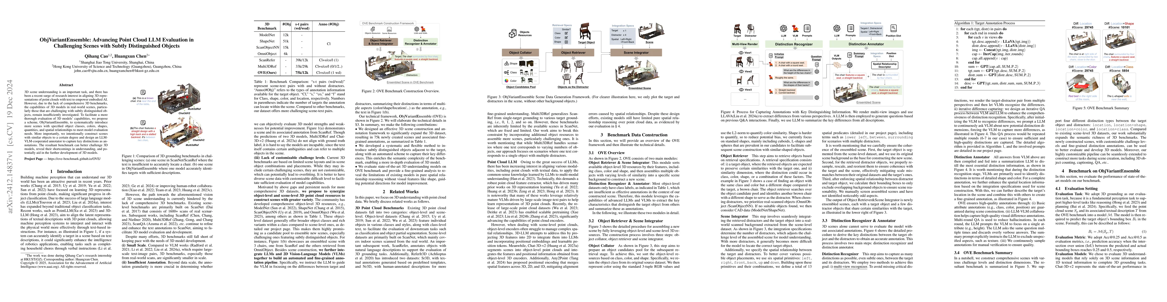 The paper introduces ObjVariantEnsemble, a method to enhance the evaluation of 3D models in complex scenes with subtly distinguished objects by creating a comprehensive benchmark featuring varied object classes, colors, shapes, quantities, and spatial relationships. The benchmark, developed using an LLM-VLM-cooperated annotator, aims to better challenge 3D models and uncover their limitations in understanding such environments.