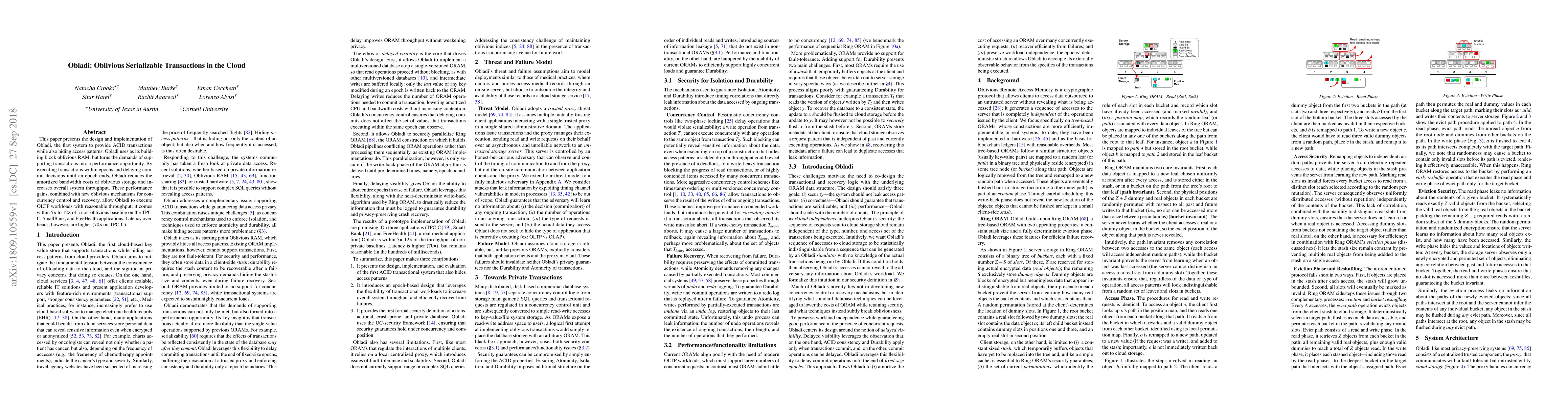 This paper presents the design and implementation of Obladi, the first system to provide ACID transactions while also hiding access patterns. Obladi uses as its building block oblivious RAM, but turns the demands of supporting transactions into a performance opportunity. By executing transactions within epochs and delaying commit decisions until an epoch ends, Obladi reduces the amortized bandwidth costs of oblivious storage and increases overall system throughput. These performance gains, combined with new oblivious mechanisms for concurrency control and recovery, allow Obladi to execute OLTP workloads with reasonable throughput: it comes within 5x to 12x of a non-oblivious baseline on the TPC-C, SmallBank, and FreeHealth applications. Latency overheads, however, are higher (70x on TPC-C).