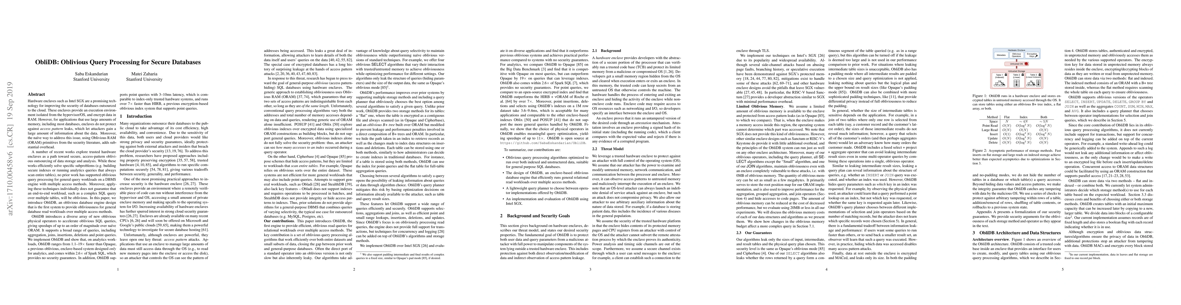 ObliDB introduces a novel oblivious database engine design that efficiently processes general query workloads while preventing access pattern leaks, outperforming previous systems in speed and latency for both analytics and point queries. This work marks the first comprehensive solution for oblivious query processing across multiple access methods in a DBMS engine.