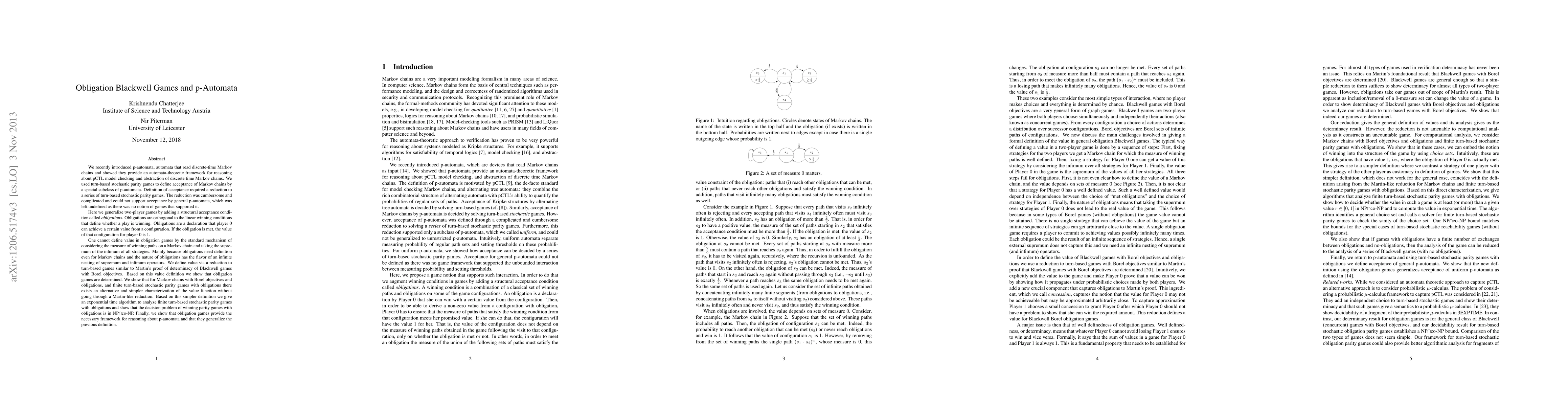 The paper introduces p-automata and generalizes two-player games by adding a structural acceptance condition called obligations. It defines value via a reduction to turn-based games, proves determinacy of obligation games, and provides an exponential time algorithm for finite turn-based stochastic parity games with obligations.