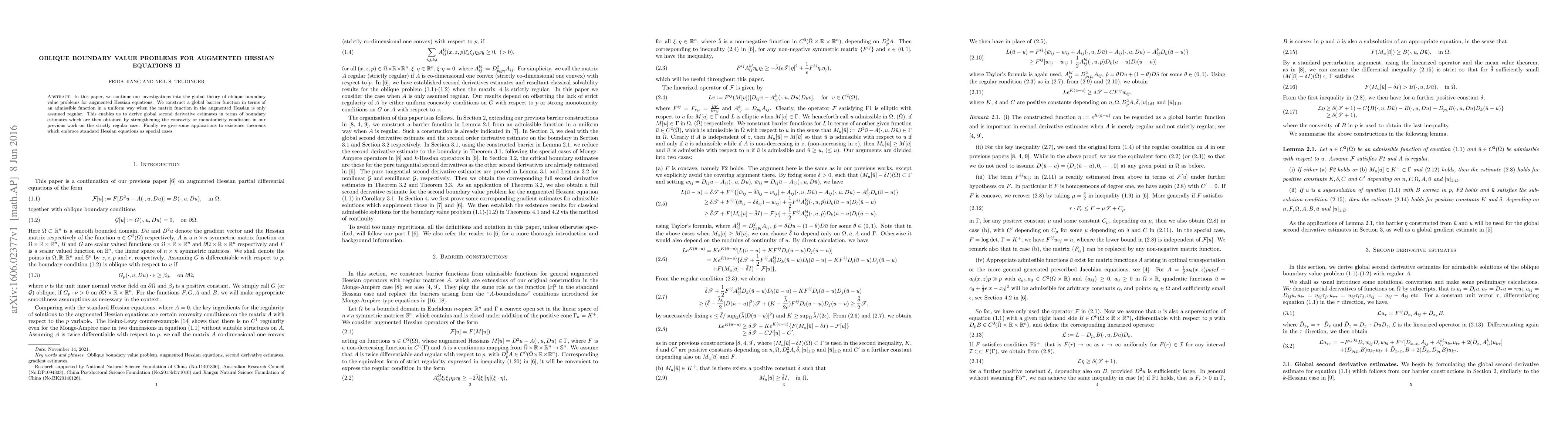 In this paper, we continue our investigations into the global theory of oblique boundary value problems for augmented Hessian equations. We construct a global barrier function in terms of an admissible function in a uniform way when the matrix function in the augmented Hessian is only assumed regular. This enables us to derive global second derivative estimates in terms of boundary estimates which are then obtained by strengthening the concavity or monotonicity conditions in our previous work on the strictly regular case. Finally we give some applications to existence theorems which embrace standard Hessian equations as special cases.