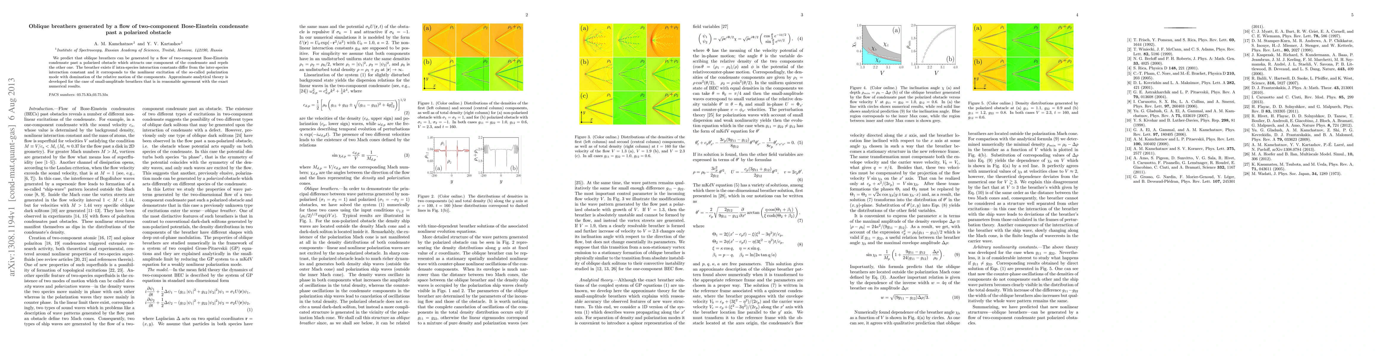 We predict that oblique breathers can be generated by a flow of two-component Bose-Einstein condensate past a polarized obstacle which attracts one component of the condensate and repels the other one. The breather exists if intra-species interaction constants differ from the inter-species interaction constant and it corresponds to the nonlinear excitation of the so-called polarization mode with domination of the relative motion of the components. Approximate analytical theory is developed for the case of small-amplitude breathers that is in reasonable agreement with the exact numerical results.