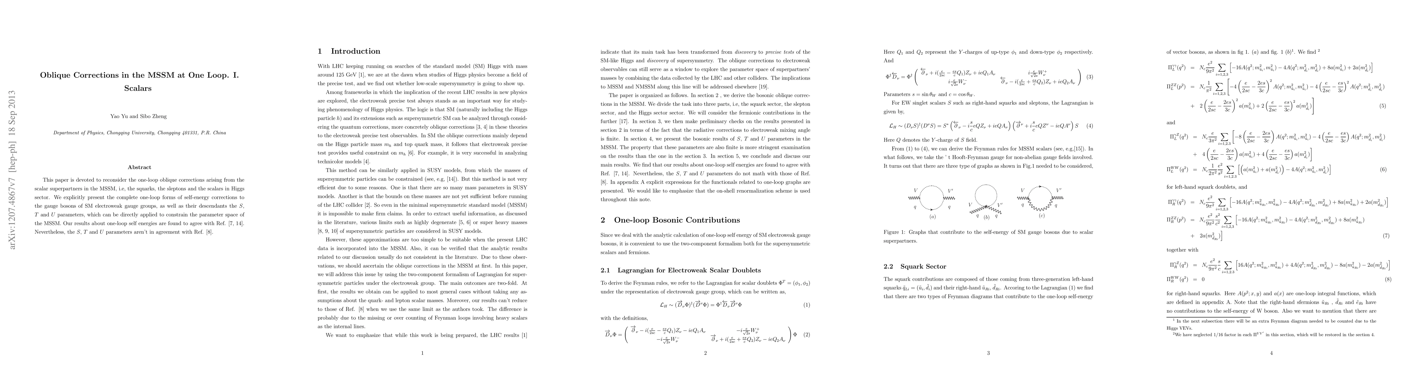 This paper provides a complete one-loop analysis of scalar superpartner contributions to oblique corrections in the MSSM, presenting the self-energy corrections for SM electroweak gauge bosons and deriving the $S$, $T$, and $U$ parameters. While the self-energy results match previous studies, discrepancies arise in the $S$, $T$, and $U$ parameters compared to another work.