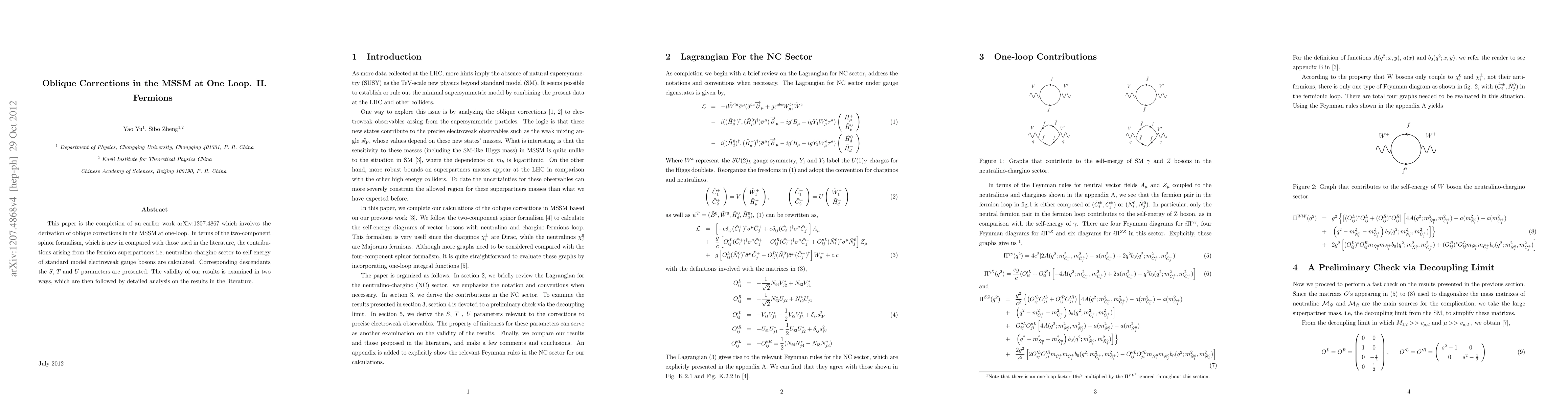 This paper calculates oblique corrections in the Minimal Supersymmetric Model (MSSM) at one loop for fermion superpartners, introducing a new two-component spinor formalism, and derives $S$, $T$, and $U$ parameters.
