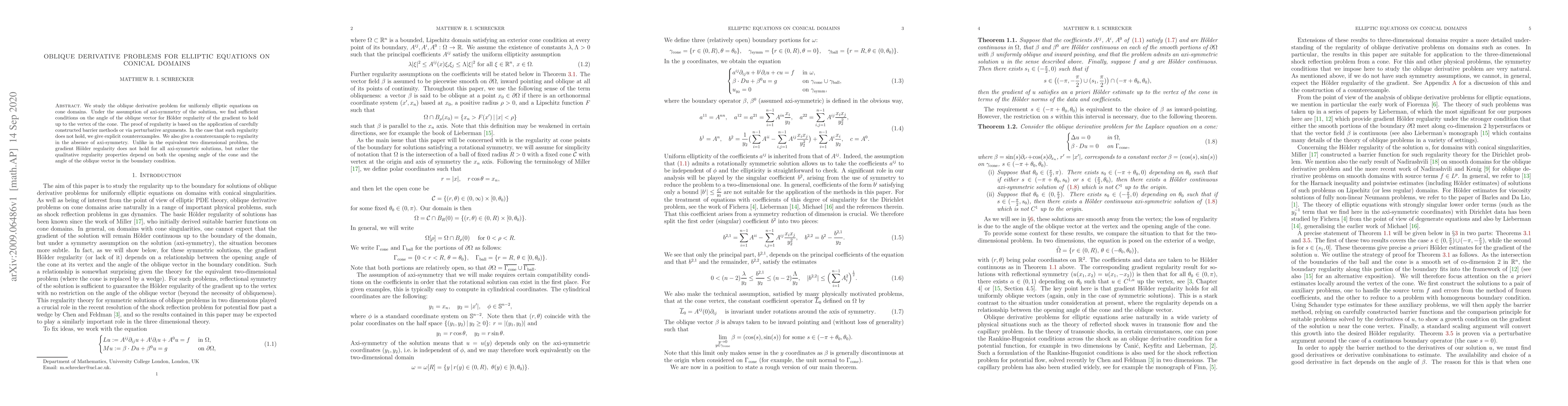 We study the oblique derivative problem for uniformly elliptic equations on cone domains. Under the assumption of axi-symmetry of the solution, we find sufficient conditions on the angle of the oblique vector for H\"older regularity of the gradient to hold up to the vertex of the cone. The proof of regularity is based on the application of carefully constructed barrier methods or via perturbative arguments. In the case that such regularity does not hold, we give explicit counterexamples. We also give a counterexample to regularity in the absence of axi-symmetry. Unlike in the equivalent two dimensional problem, the gradient H\"older regularity does not hold for all axi-symmetric solutions, but rather the qualitative regularity properties depend on both the opening angle of the cone and the angle of the oblique vector in the boundary condition.