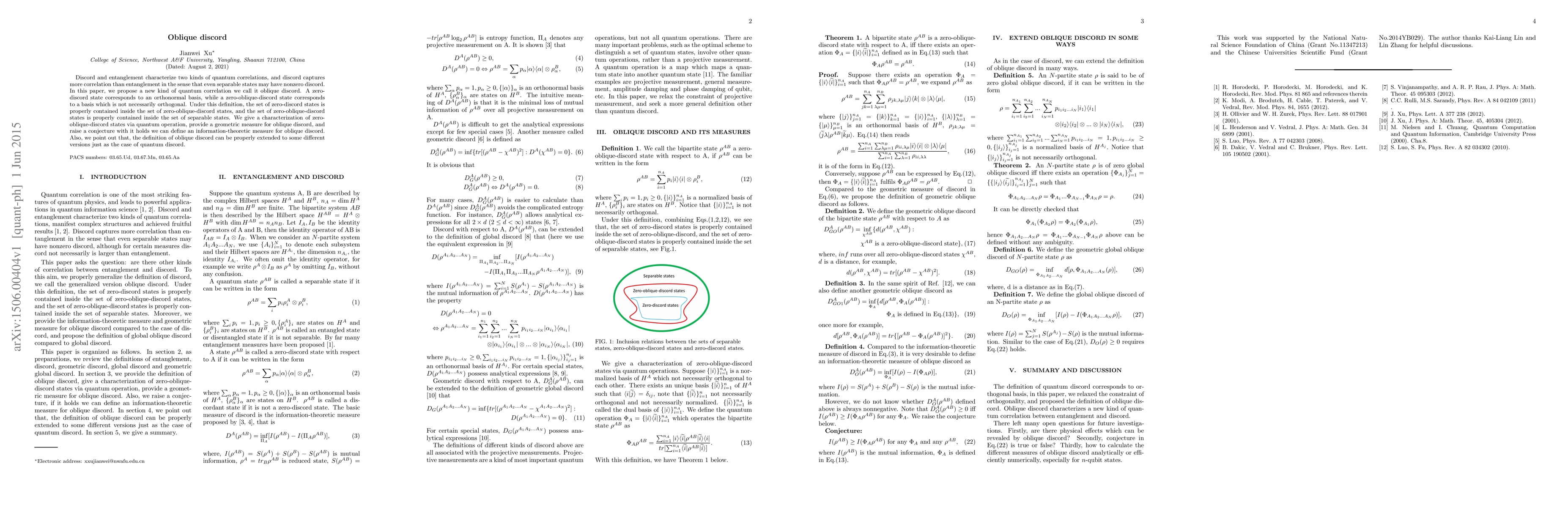 This paper introduces a new quantum correlation termed oblique discord, which captures more correlation than quantum discord. It defines oblique discord for states that are not necessarily orthogonal, thus encompassing a broader set of separable states than zero-discord states.