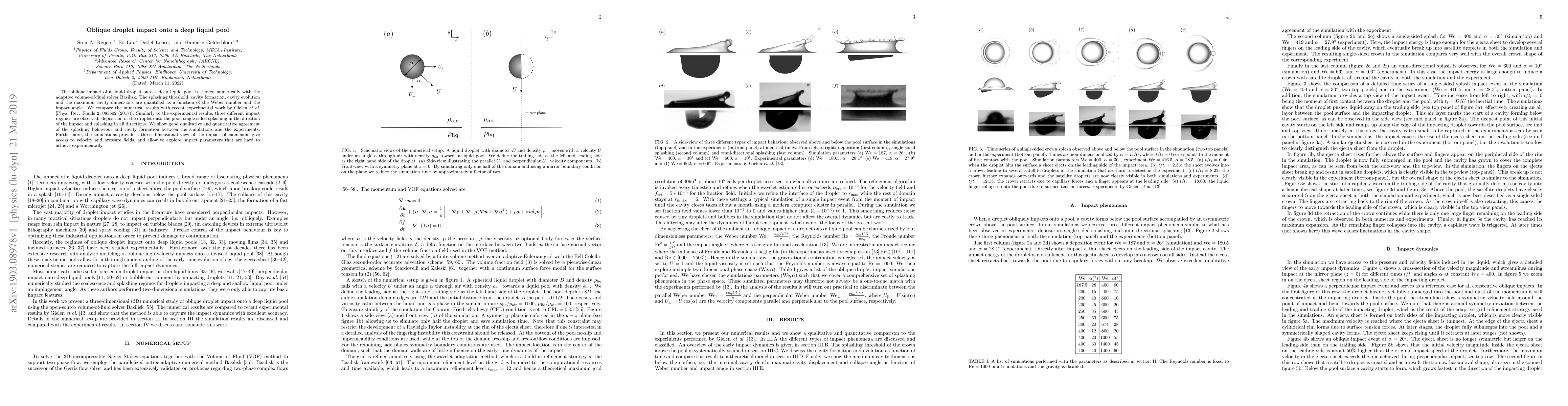 The oblique impact of a liquid droplet onto a deep liquid pool is studied numerically with the adaptive volume-of-fluid solver Basilisk. The splashing threshold, cavity formation, cavity evolution and the maximum cavity dimensions are quantified as a function of the Weber number and the impact angle. We compare the numerical results with recent experimental work by Gielen et al. [Phys. Rev. Fluids 2, 083602 (2017)]. Similarly to the experimental results, three different impact regimes are observed: deposition of the droplet onto the pool, single-sided splashing in the direction of the impact and splashing in all directions. We show good qualitative and quantitative agreement of the splashing behaviour and cavity formation between the simulations and the experiments. Furthermore, the simulations provide a three dimensional view of the impact phenomenon, give access to velocity and pressure fields, and allow to explore impact parameters that are hard to achieve experimentally.