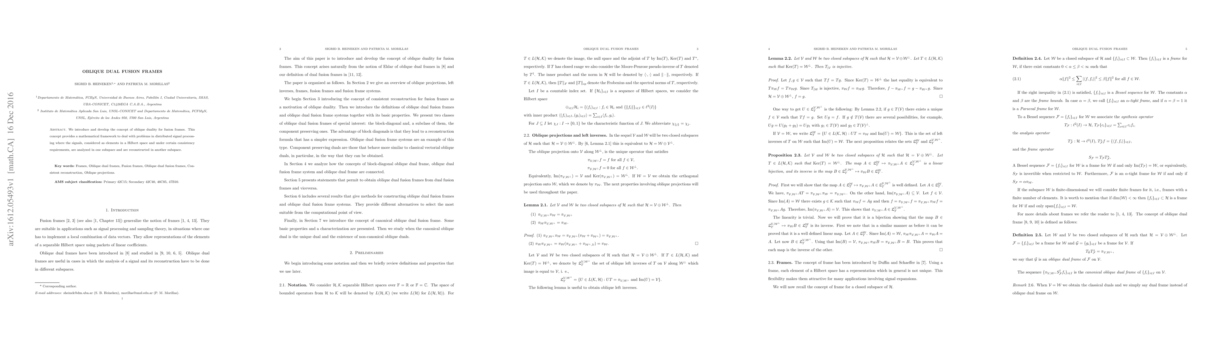 Summary: This paper introduces oblique duality for fusion frames, offering a mathematical framework for distributed signal processing, where signals are analyzed in one subspace and reconstructed in another, addressing consistency requirements in Hilbert space.