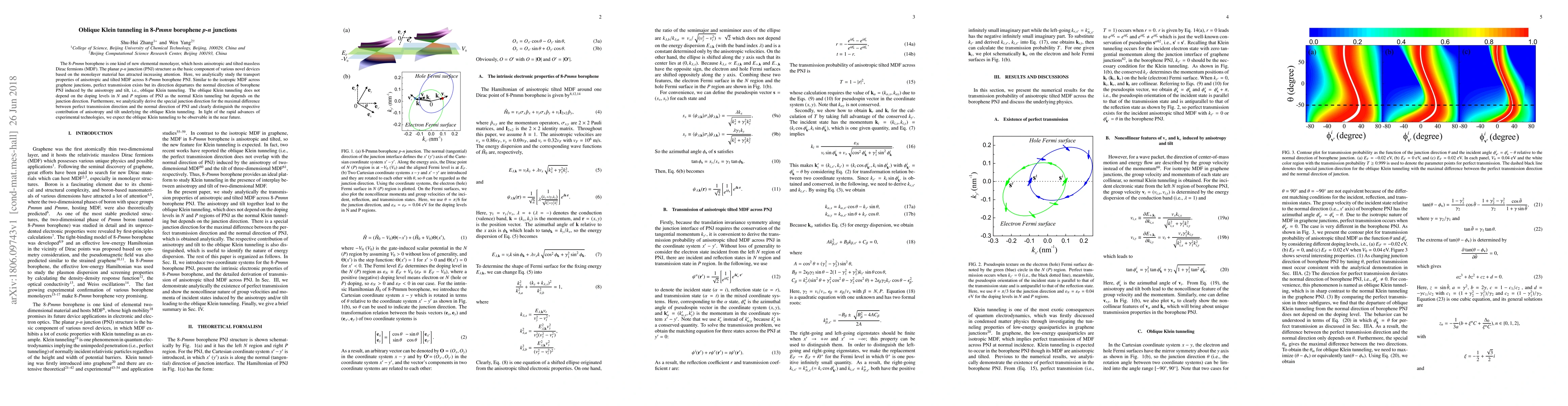 This research investigates the transport properties of anisotropic and tilted massless Dirac fermions in 8-Pmmn borophene p-n junctions, discovering a phenomenon termed oblique Klein tunneling. Unlike normal Klein tunneling, this does not depend on doping levels but on the junction direction, with a specific direction yielding maximal transmission deviation.