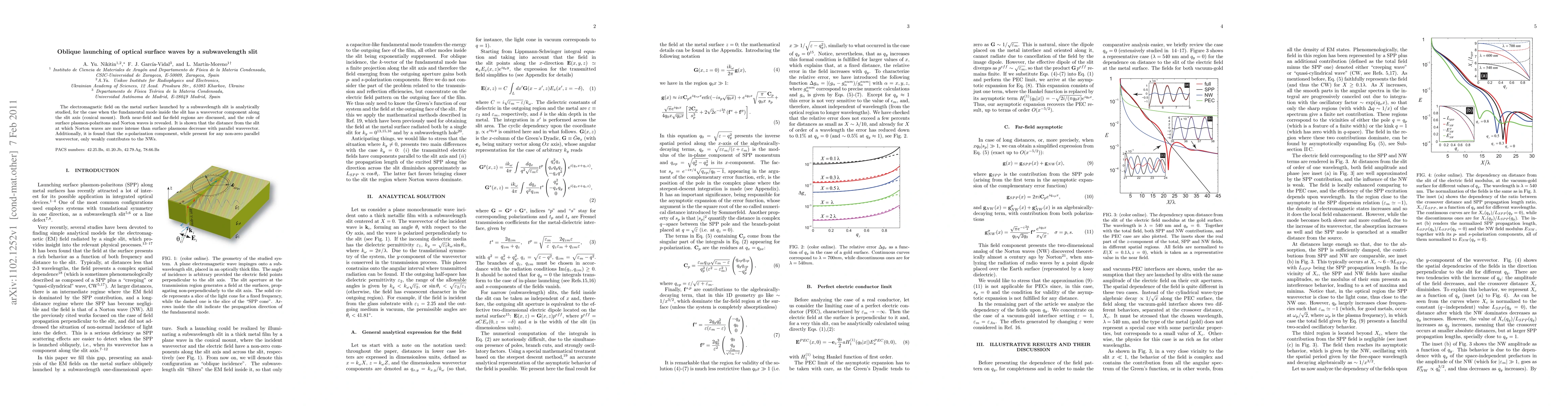 This paper analytically studies the electromagnetic field launched by a subwavelength slit, focusing on oblique launching of optical surface waves. It reveals that the intensity of Norton waves relative to surface plasmon-polaritons decreases with increasing parallel wavevector, aiding experimental studies on Norton waves, while the s-polarization component has a minor effect on these waves.