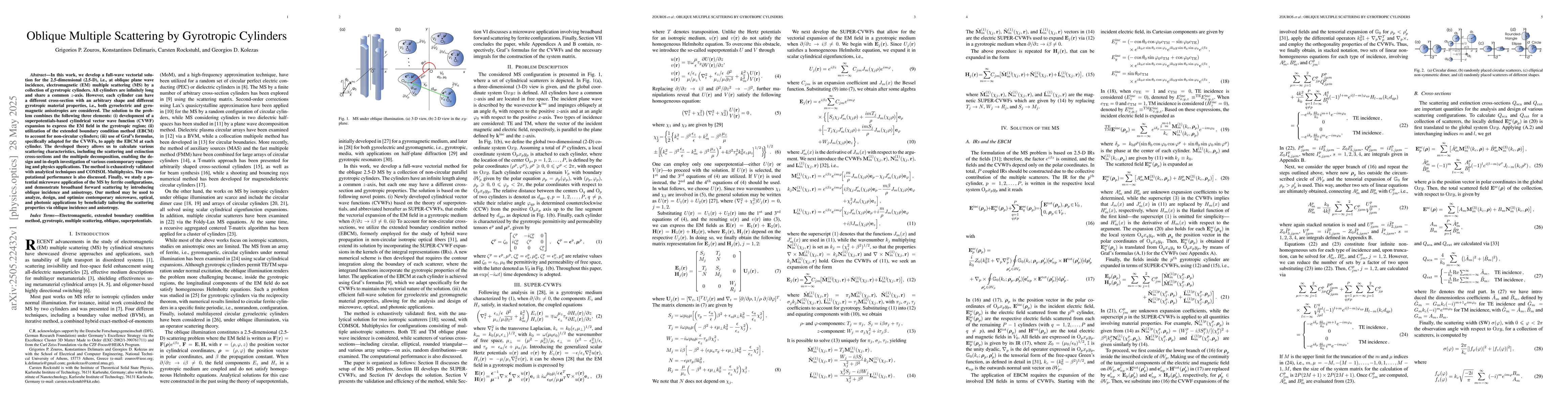 The research develops a full-wave vectorial solution for oblique multiple scattering by gyrotropic cylinders using a superpotentials-based cylindrical vector wave function (CVWF) expansion, extended boundary condition method (EBCM), and adapted Graf's formulas for non-circular cylinders.