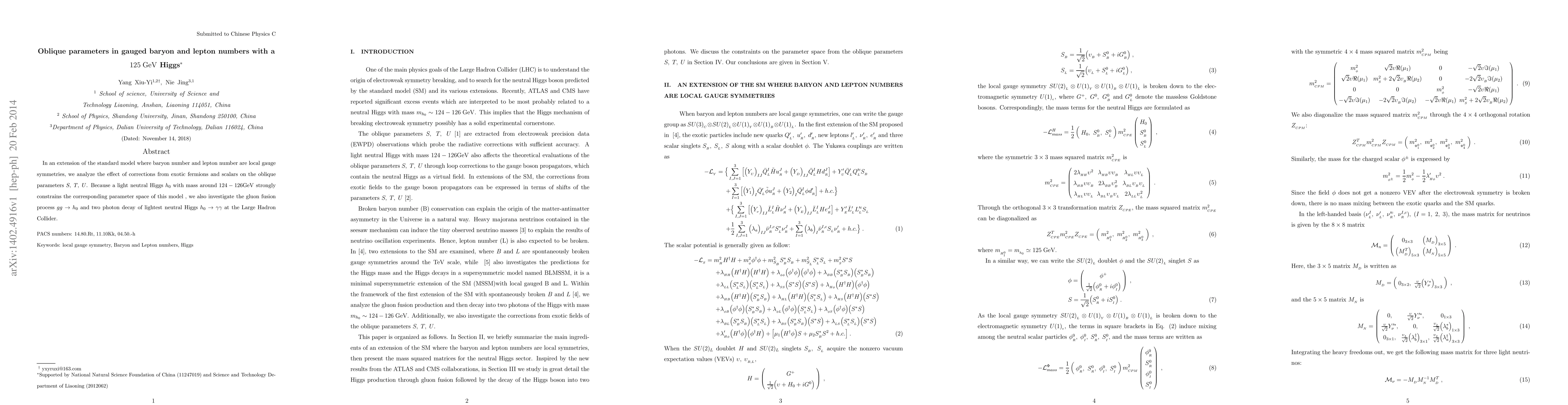 In an extension of the standard model where baryon number and lepton number are local gauge symmetries, we analyze the effect of corrections from exotic fermions and scalars on the oblique parameters $S,\;T,\;U$. Because a light neutral Higgs $h_0$ with mass around $124-126{\rm GeV}$ strongly constrains the corresponding parameter space of this model, we also investigate the gluon fusion process $gg\rightarrow h_0$ and two photon decay of lightest neutral Higgs $h_0\rightarrow\gamma\gamma$ at the Large Hadron Collider.