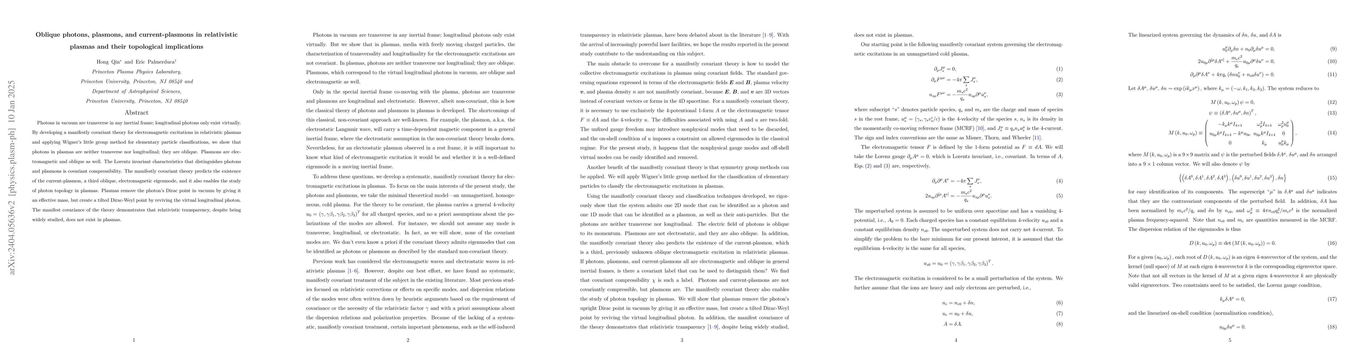 This paper develops a covariant theory for electromagnetic excitations in relativistic plasmas, revealing that photons and plasmons are oblique rather than strictly transverse or longitudinal. It introduces the current-plasmon as an additional oblique eigenmode and explores the topological implications of these findings.