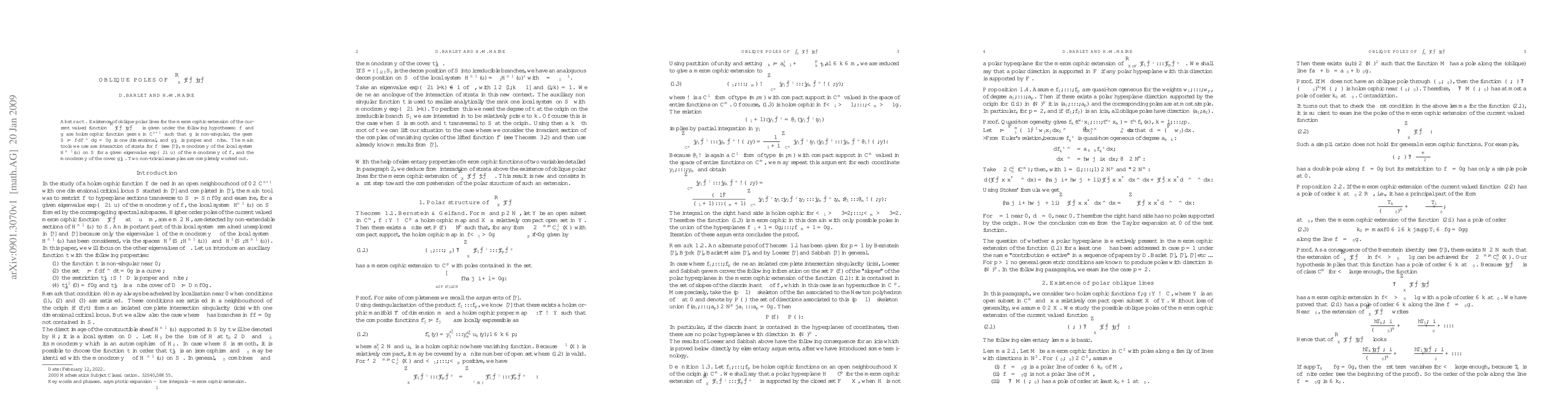 Existence of oblique polar lines for the meromorphic extension of the current valued function $\int |f|^{2\lambda}|g|^{2\mu}\square$ is given under the following hypotheses: $f$ and $g$ are holomorphic function germs in $\CC^{n+1}$ such that $g$ is non-singular, the germ $S:=\ens{\d f\wedge \d g =0}$ is one dimensional, and $g|_S$ is proper and finite. The main tools we use are interaction of strata for $f$ (see \cite{B:91}), monodromy of the local system $H^{n-1}(u)$ on $S$ for a given eigenvalue $\exp(-2i\pi u)$ of the monodromy of $f$, and the monodromy of the cover $g|_S$. Two non-trivial examples are completely worked out.