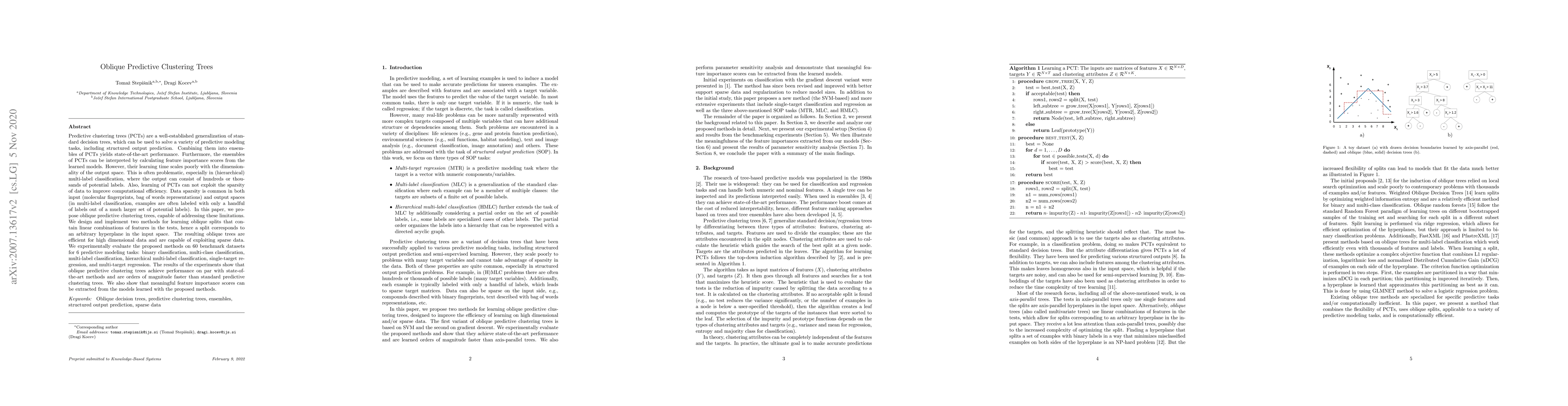 This paper proposes oblique predictive clustering trees (O-PCTs) to address the scalability issues of standard predictive clustering trees (PCTs) in high-dimensional and sparse data scenarios. The new O-PCTs use oblique splits that are hyperplanes, improving efficiency and performance, and are shown to achieve comparable results to state-of-the-art methods while being significantly faster.