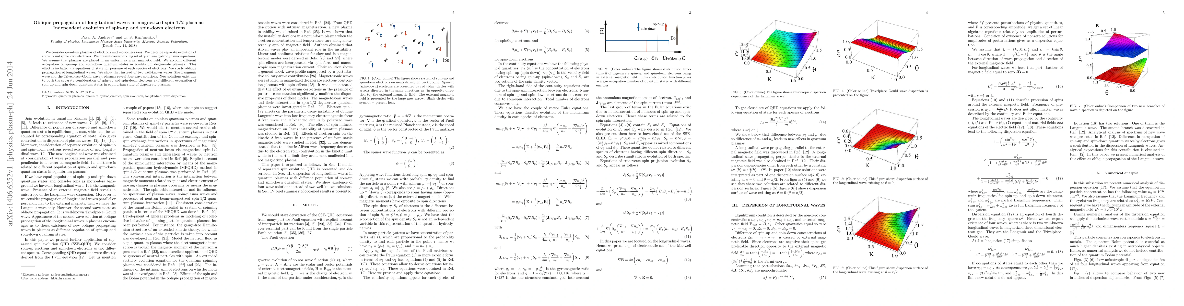 This paper investigates the oblique propagation of longitudinal waves in magnetized spin-1/2 plasmas, focusing on the independent evolution of spin-up and spin-down electrons. It reveals four wave solutions instead of the usual two, due to the separate treatment of spin states and different occupations of these states in the equilibrium degenerate plasma.