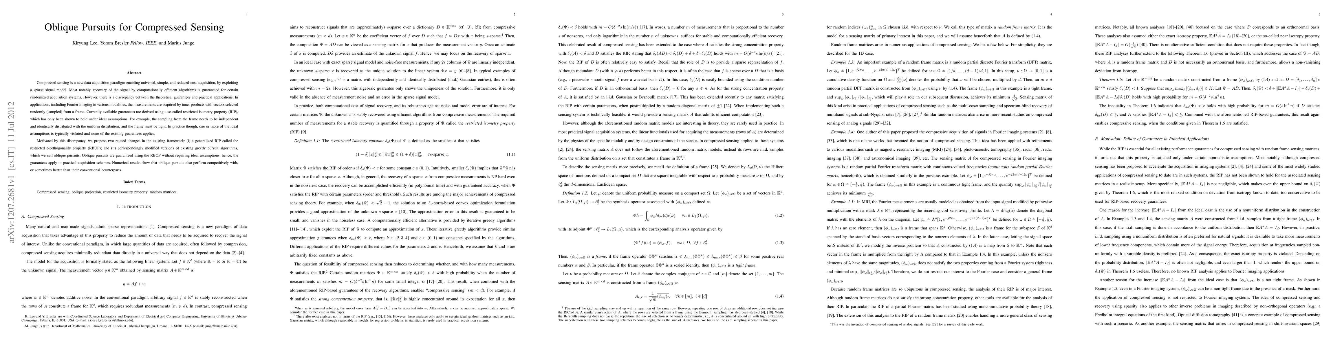 Compressed sensing is a new data acquisition paradigm enabling universal, simple, and reduced-cost acquisition, by exploiting a sparse signal model. Most notably, recovery of the signal by computationally efficient algorithms is guaranteed for certain randomized acquisition systems. However, there is a discrepancy between the theoretical guarantees and practical applications. In applications, including Fourier imaging in various modalities, the measurements are acquired by inner products with vectors selected randomly (sampled) from a frame. Currently available guarantees are derived using a so-called restricted isometry property (RIP), which has only been shown to hold under ideal assumptions. For example, the sampling from the frame needs to be independent and identically distributed with the uniform distribution, and the frame must be tight. In practice though, one or more of the ideal assumptions is typically violated and none of the existing guarantees applies. Motivated by this discrepancy, we propose two related changes in the existing framework: (i) a generalized RIP called the restricted biorthogonality property (RBOP); and (ii) correspondingly modified versions of existing greedy pursuit algorithms, which we call oblique pursuits. Oblique pursuits are guaranteed using the RBOP without requiring ideal assumptions; hence, the guarantees apply to practical acquisition schemes. Numerical results show that oblique pursuits also perform competitively with, or sometimes better than their conventional counterparts.