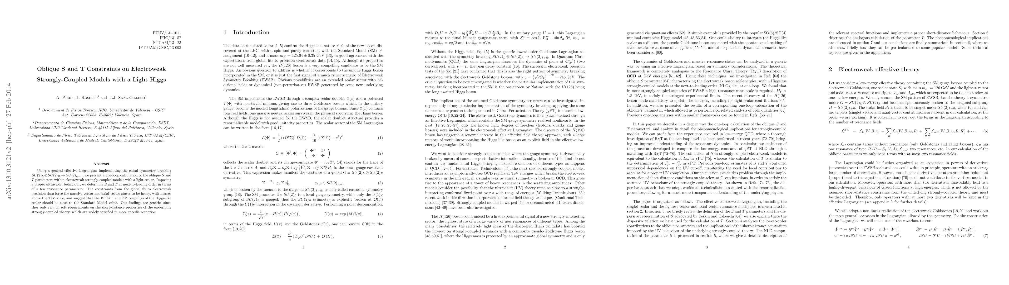 This paper calculates the oblique S and T parameters at one-loop level in electroweak strongly-coupled models featuring a light Higgs, determining them in terms of resonance parameters. The analysis finds that to satisfy precision electroweak data, the vector and axial-vector states must be heavy, with masses above the TeV scale, while the W+W- and ZZ couplings of the Higgs-like scalar should closely match Standard Model values.