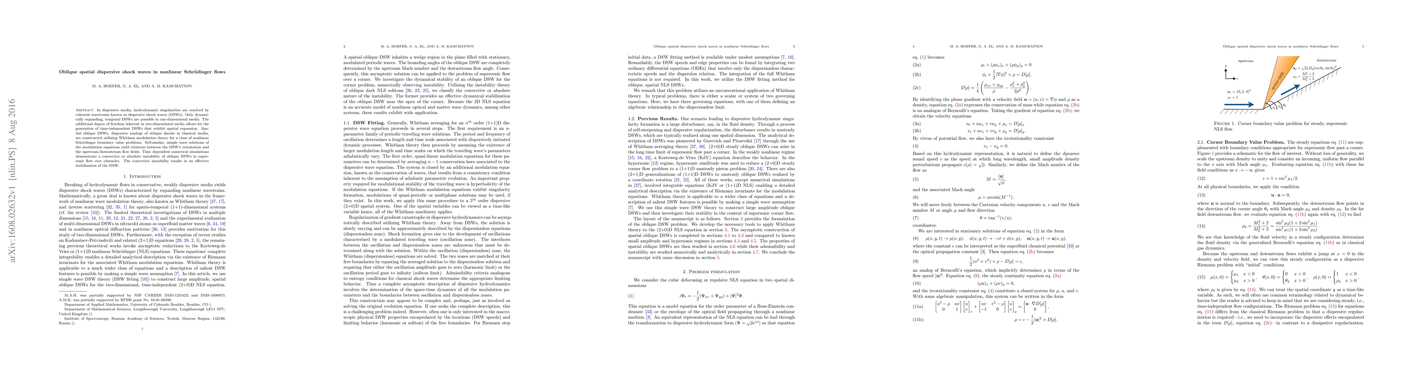 This paper constructs spatial oblique dispersive shock waves (DSWs) in two-dimensional nonlinear Schrödinger flows using Whitham modulation theory, revealing their self-similar, simple wave solutions. Numerical simulations show these DSWs exhibit convective instability in supersonic flows, leading to their stabilization.