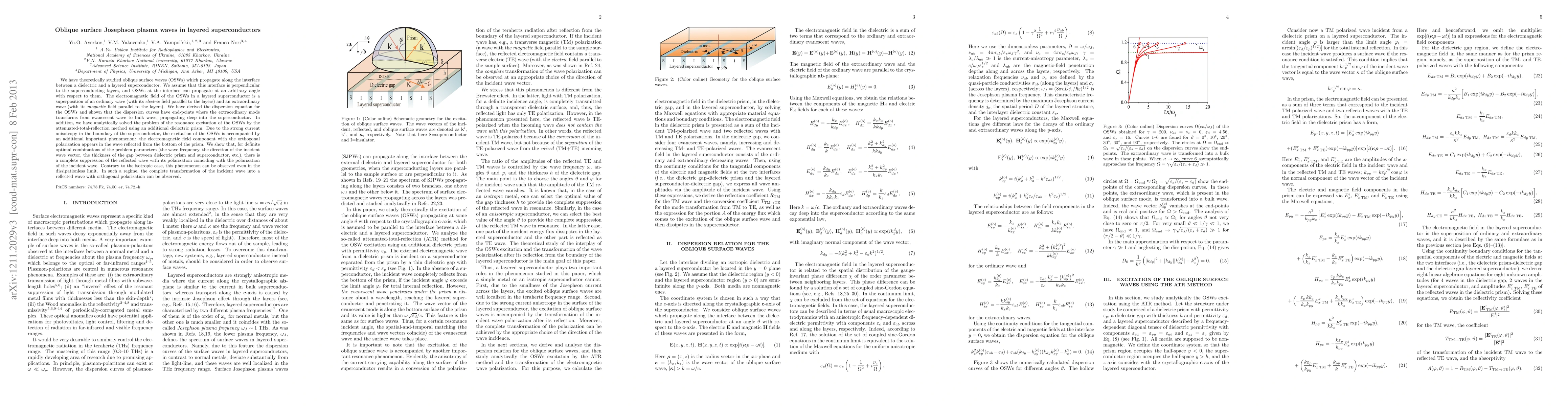 The research employs theoretical analysis, deriving equations for electromagnetic fields in layered superconductors and dielectric prisms, and solving them to study oblique surface waves (OSWs).
