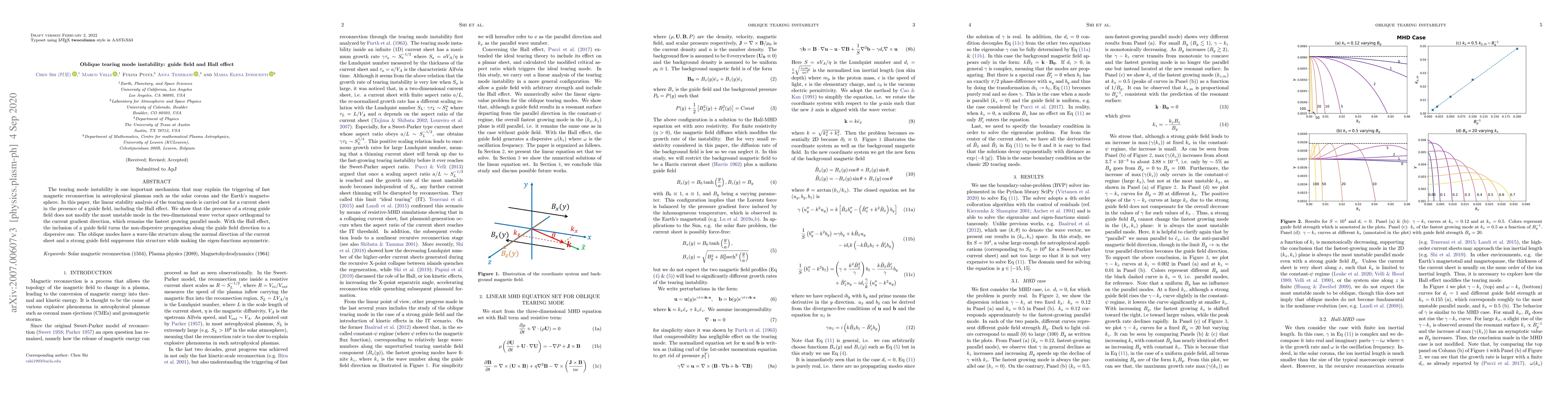 This paper investigates the linear stability of oblique tearing mode instabilities in astrophysical plasmas, considering a guide field and the Hall effect. The study finds that a strong guide field does not alter the fastest growing parallel mode, while the Hall effect induces dispersive propagation and suppresses wave-like structures in oblique modes.
