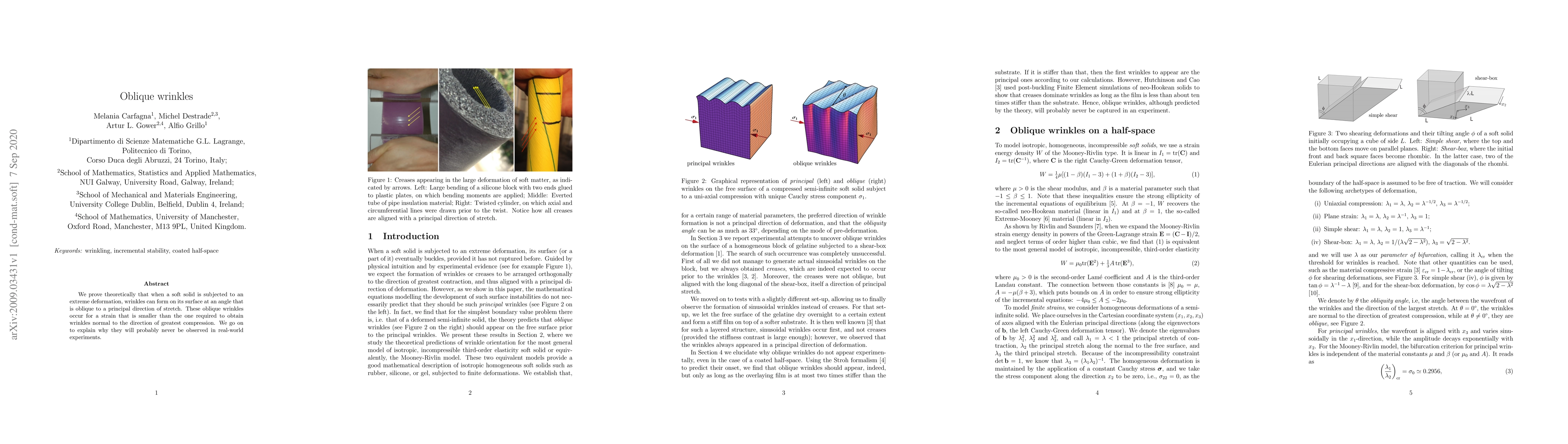 We prove theoretically that when a soft solid is subjected to an extreme deformation, wrinkles can form on its surface at an angle that is oblique to a principal direction of stretch. These oblique wrinkles occur for a strain that is smaller than the one required to obtain wrinkles normal to the direction of greatest compression. We go on to explain why they will probably never be observed in real-world experiments.