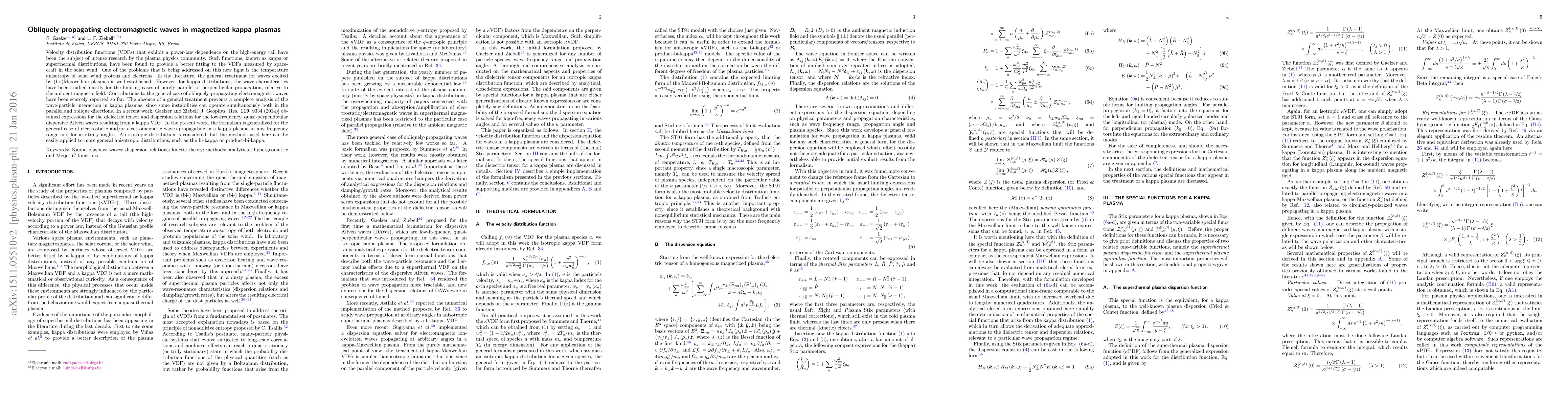 This paper generalizes the formalism for analyzing the propagation of electromagnetic waves in magnetized kappa plasmas, extending beyond the established treatments for parallel or perpendicular propagation to cover obliquely-propagating waves. The study aims to provide a comprehensive analysis of wave-particle interactions in such plasmas, which are often found in the solar wind.