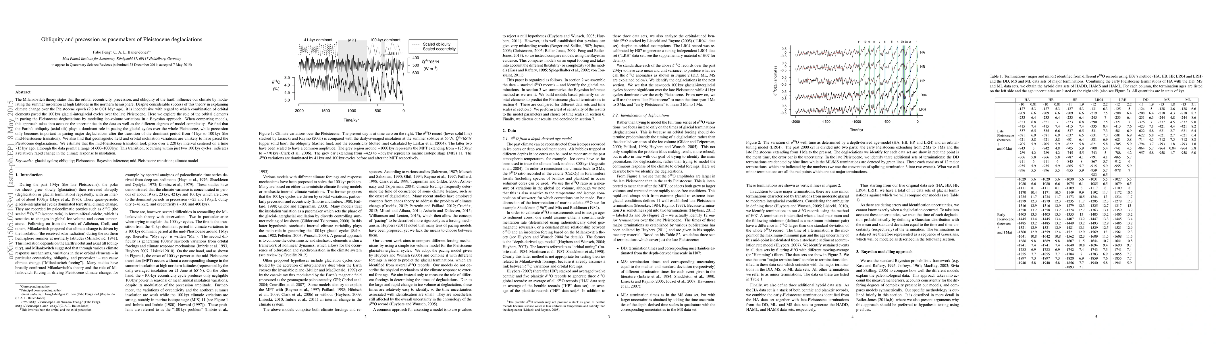 The Milankovitch theory states that the orbital eccentricity, precession, and obliquity of the Earth influence our climate by modulating the summer insolation at high latitudes in the northern hemisphere. Despite considerable success of this theory in explaining climate change over the Pleistocene epoch (2.6 to 0.01 Myr ago), it is inconclusive with regard to which combination of orbital elements paced the 100 kyr glacial-interglacial cycles over the late Pleistocene. Here we explore the role of the orbital elements in pacing the Pleistocene deglaciations by modeling ice-volume variations in a Bayesian approach. When comparing models, this approach takes into account the uncertainties in the data as well as the different degrees of model complexity. We find that the Earth's obliquity (axial tilt) plays a dominant role in pacing the glacial cycles over the whole Pleistocene, while precession only becomes important in pacing major deglaciations after the transition of the dominant period from 41 kyr to 100 kyr (the mid-Pleistocene transition). We also find that geomagnetic field and orbital inclination variations are unlikely to have paced the Pleistocene deglaciations. We estimate that the mid-Pleistocene transition took place over a 220 kyr interval centered on a time 715 kyr ago, although the data permit a range of 600--1000 kyr. This transition, occurring within just two 100\,kyr cycles, indicates a relatively rapid change in the climate response to insolation.