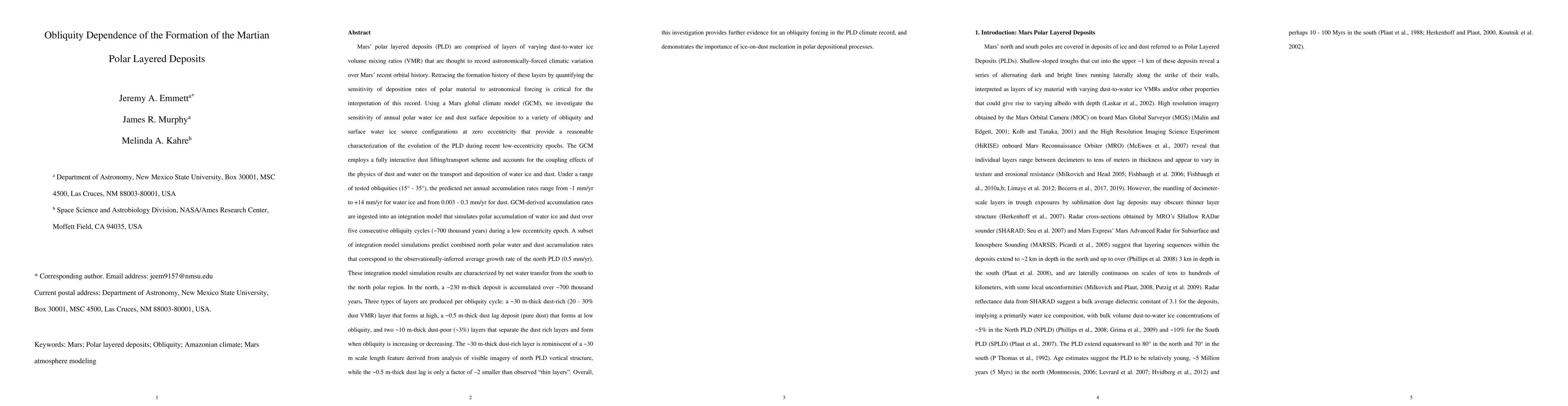 Mars' polar layered deposits (PLD) are comprised of layers of varying dust-to-water ice volume mixing ratios (VMR) that may record astronomically-forced climatic variation over Mars' recent orbital history. Retracing the formation of these layers by quantifying the sensitivity of deposition rates of polar material to astronomical forcing is critical for the interpretation of this record. Using a Mars global climate model (GCM), we investigate the sensitivity of annual polar water ice and dust surface deposition to various obliquities and surface water ice distributions at zero eccentricity, providing a reasonable characterization of the evolution of the PLD during recent low-eccentricity epochs. For obliquities between 15{\deg} - 35{\deg}, predicted net annual accumulation rates range from -1 to +14 mm/yr for water ice and from +0.003 to +0.3 mm/yr for dust. GCM-derived rates are ingested into an integration model that simulates polar accumulation of water ice and dust over 5 consecutive obliquity cycles (~700 kyrs) during a low eccentricity epoch. A subset of integration simulations predict combined accumulation of water ice and dust in the north at time averaged rates that are near the observationally-inferred value of 0.5 mm/yr. Three types of layers are produced per obliquity cycle: a ~30 m-thick dust-rich (~25% dust VMR) layer forms at high obliquity, a ~0.5 m-thick dust lag forms at low obliquity, and two ~10 m-thick dust-poor (~3%) layers form when obliquity is increasing/decreasing. The ~30 m-thick dust-rich layer is reminiscent of a ~30 m feature derived from visible imagery analysis the north PLD, while the ~0.5 m-thick dust lag is a factor of ~2 smaller than observed "thin layers". Overall, this investigation provides further evidence for obliquity forcing in the PLD climate record, and demonstrates the importance of ice-on-dust nucleation in polar depositional processes.