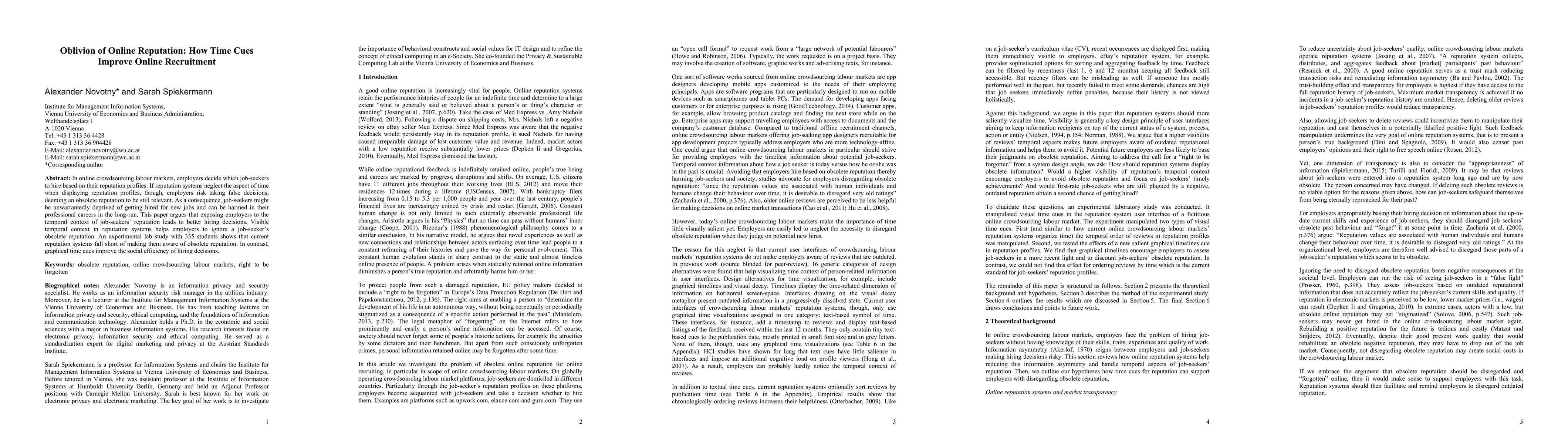 This paper investigates how time cues in online reputation profiles can enhance hiring decisions in crowdsourcing labor markets. Experimental results show that current reputation systems fail to highlight obsolete reputations, but incorporating temporal context through graphical time cues significantly improves the accuracy and fairness of hiring decisions.