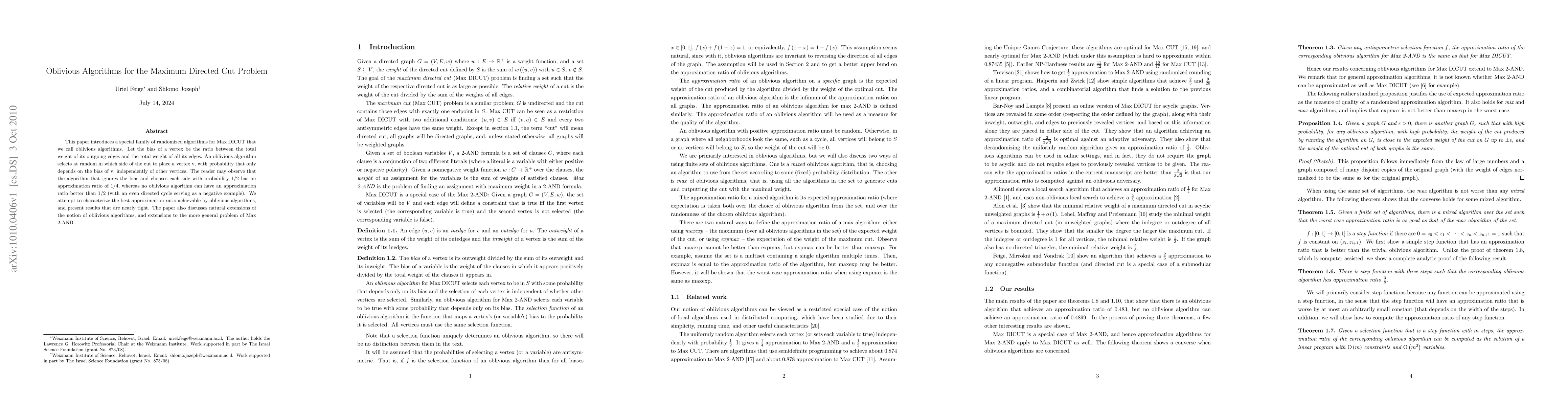 This paper explores a class of randomized algorithms called oblivious algorithms for the Max DICUT problem, which select vertices for cuts based on their bias, independent of other vertices. It establishes that no oblivious algorithm can achieve an approximation ratio better than 1/2, presenting nearly tight results and discussing extensions to the Max 2-AND problem.