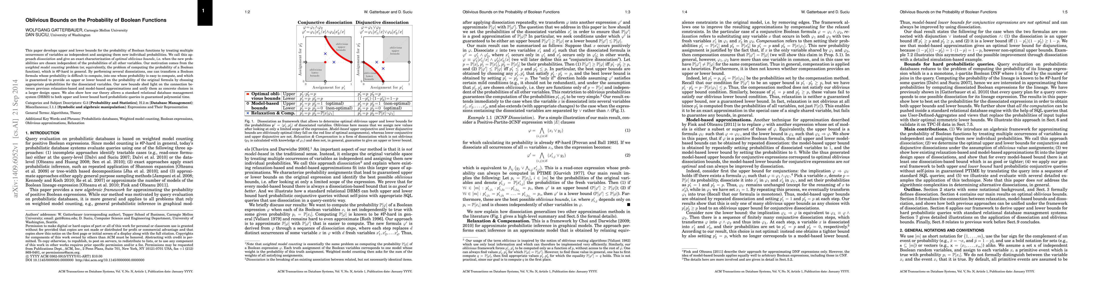 This paper introduces dissociation, a method to develop upper and lower bounds on the probability of Boolean functions by treating variable occurrences independently, thereby simplifying complex probability computations. The approach provides a unified framework for previous approximation methods and enables relational DBMS to efficiently bound hard probabilistic queries.