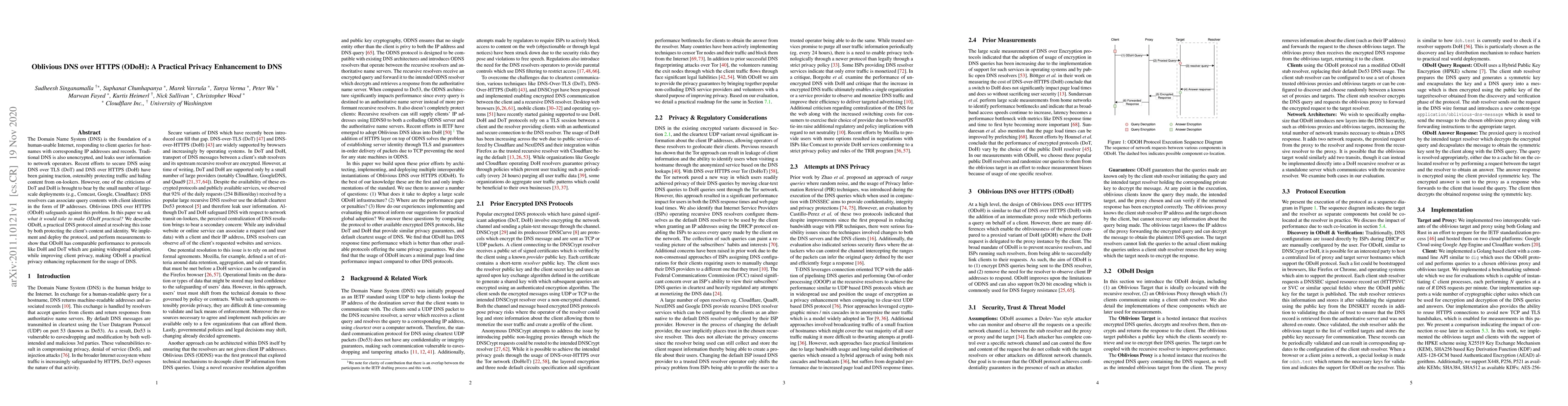 Oblivious DNS over HTTPS (ODoH) aims to enhance privacy by protecting both the content and identity of DNS queries, addressing the shortcomings of DNS over TLS (DoT) and DNS over HTTPS (DoH) where resolvers can link queries to client IP addresses. The paper demonstrates ODoH's practical deployment and shows it offers comparable performance to DoH and DoT while significantly improving client privacy.