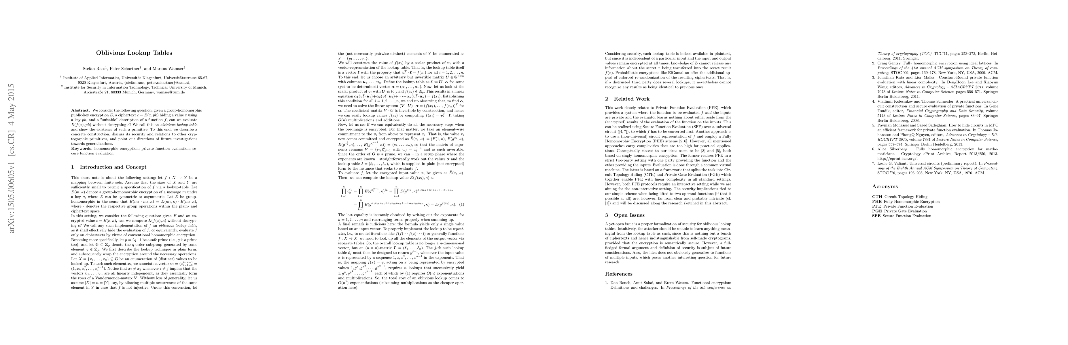 This research introduces 'Oblivious Lookup Tables,' a cryptographic primitive allowing evaluation of a function on an encrypted value without decryption. The paper presents a concrete construction, discusses its security, and suggests future research directions.
