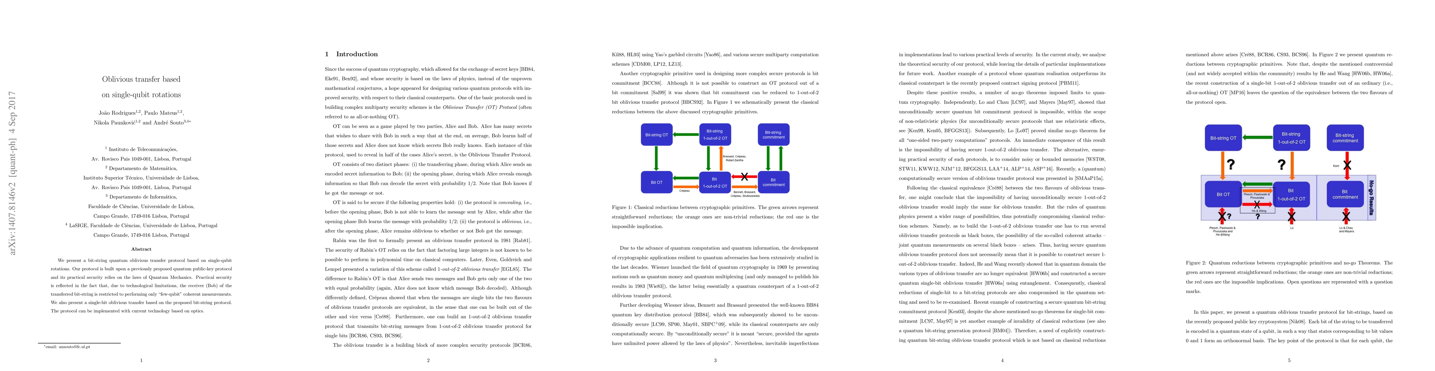The paper introduces a quantum oblivious transfer protocol using single-qubit rotations, which can be practically implemented with current optical technology, ensuring security through the limitations of few-qubit coherent measurements.