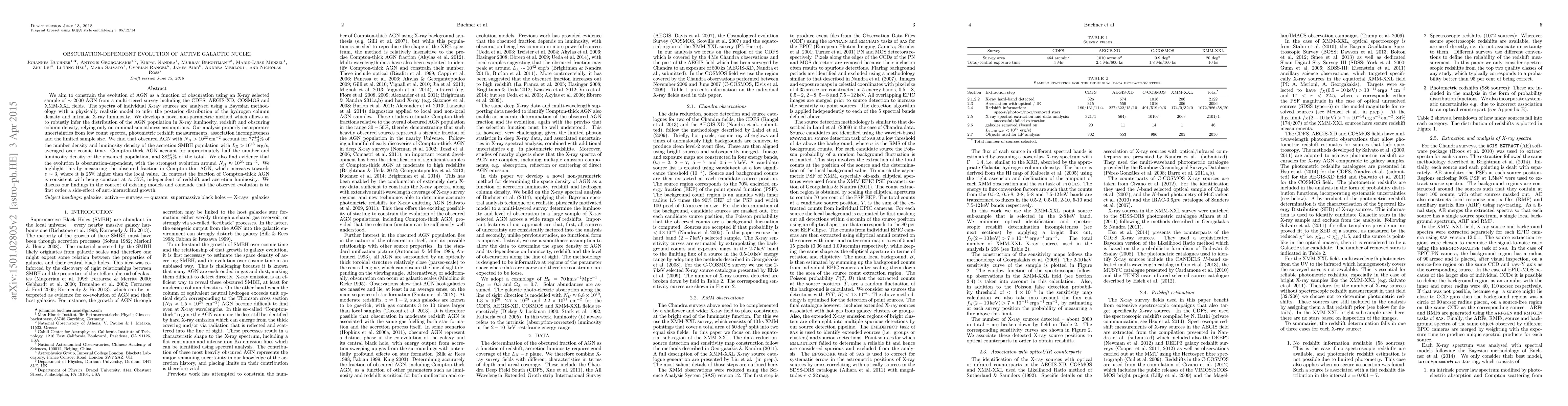 We aim to constrain the evolution of AGN as a function of obscuration using an X-ray selected sample of $\sim2000$ AGN from a multi-tiered survey including the CDFS, AEGIS-XD, COSMOS and XMM-XXL fields. The spectra of individual X-ray sources are analysed using a Bayesian methodology with a physically realistic model to infer the posterior distribution of the hydrogen column density and intrinsic X-ray luminosity. We develop a novel non-parametric method which allows us to robustly infer the distribution of the AGN population in X-ray luminosity, redshift and obscuring column density, relying only on minimal smoothness assumptions. Our analysis properly incorporates uncertainties from low count spectra, photometric redshift measurements, association incompleteness and the limited sample size. We find that obscured AGN with $N_{H}>{\rm 10^{22}\, cm^{-2}}$ account for ${77}^{+4}_{-5}\%$ of the number density and luminosity density of the accretion SMBH population with $L_{{\rm X}}>10^{43}\text{ erg/s}$, averaged over cosmic time. Compton-thick AGN account for approximately half the number and luminosity density of the obscured population, and ${38}^{+8}_{-7}\%$ of the total. We also find evidence that the evolution is obscuration-dependent, with the strongest evolution around $N_{H}\thickapprox10^{23}\text{ cm}^{-2}$. We highlight this by measuring the obscured fraction in Compton-thin AGN, which increases towards $z\sim3$, where it is $25\%$ higher than the local value. In contrast the fraction of Compton-thick AGN is consistent with being constant at $\approx35\%$, independent of redshift and accretion luminosity. We discuss our findings in the context of existing models and conclude that the observed evolution is to first order a side-effect of anti-hierarchical growth.
