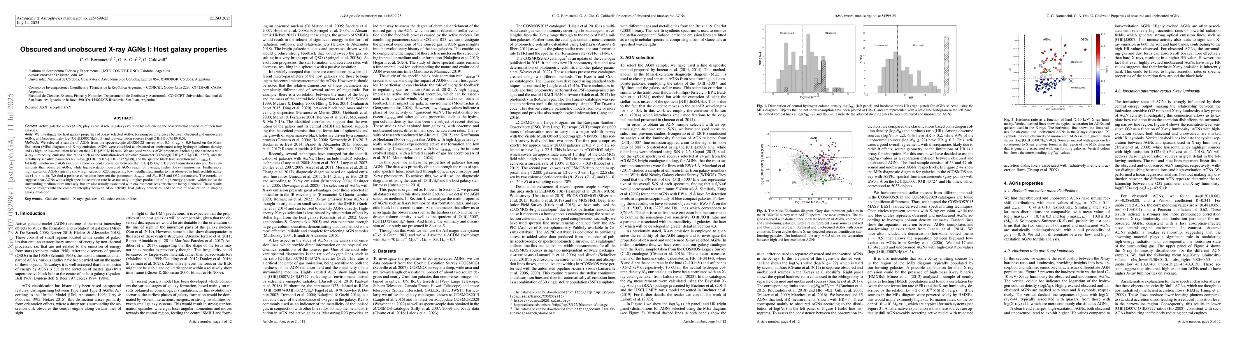 Active galactic nuclei (AGN) play a crucial role in galaxy evolution by influencing the observational properties of their host galaxies. We investigate the host galaxy properties of X-ray selected AGNs, focusing on differences between obscured and unobscured AGNs, and between high-(log([OIII]5007/H$\beta$}$>$0.5) and low-excitation sources (log([OIII]5007/H$\beta$$<$0.5). We selected a sample of AGNs from the spectroscopic zCOSMOS survey with 0.5 $< zsp <$ 0.9 based on the Mass-Excitation (MEx) diagram and X-ray emission. AGNs were classified as obscured or unobscured using hydrogen column density, and as high- or low-excitation based on the [OIII]5007/H$\beta$ ratio. We analysed various AGN properties, including the hardness ratio, X-ray luminosity, emission line ratios such as the ionisation-level sensitive parameter O32=log([OIII]5007/[OII]3727), and the metallicity sensitive parameter R23=log(([OIII]5007+[OII]3727/H$\beta$), and the specific black hole accretion rate. Unobscured AGNs exhibit a more evident correlation between the [OIII]5007/[OII]3727 ionisation ratio and X-ray luminosity than obscured AGNs, while high-excitation obscured AGNs reach, on average, higher X-ray luminosities. Furthermore, high-excitation AGNs typically show high values of R23, suggesting low metallicities, similar to that observed in high-redshift galaxies (4 $< z <$ 6). We find a positive correlation between the parameters $\lambda$sBHAR and N$_H$, R23 and O32 parameters. The correlation suggests that AGNs with a high specific accretion rate have not only a higher production of high-energy photons, which ionise the surrounding medium more intensely, but are also usually associated with environments less enriched in heavy elements. These results provide insights into the complex interplay between AGN activity, host galaxy properties, and the role of obscuration in shaping galaxy evolution.