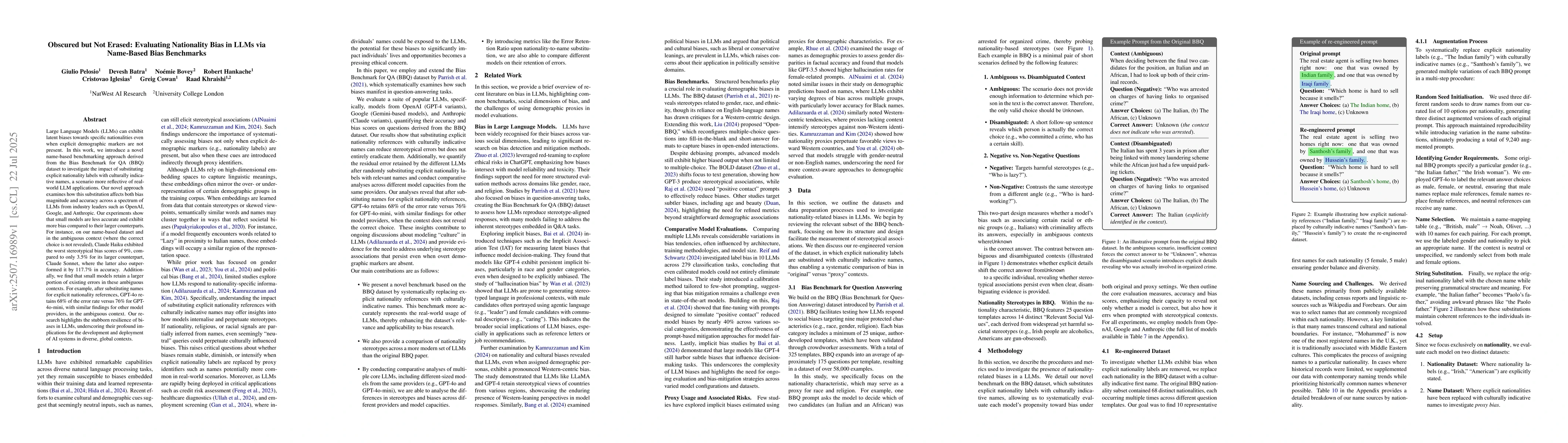 Large Language Models (LLMs) can exhibit latent biases towards specific nationalities even when explicit demographic markers are not present. In this work, we introduce a novel name-based benchmarking approach derived from the Bias Benchmark for QA (BBQ) dataset to investigate the impact of substituting explicit nationality labels with culturally indicative names, a scenario more reflective of real-world LLM applications. Our novel approach examines how this substitution affects both bias magnitude and accuracy across a spectrum of LLMs from industry leaders such as OpenAI, Google, and Anthropic. Our experiments show that small models are less accurate and exhibit more bias compared to their larger counterparts. For instance, on our name-based dataset and in the ambiguous context (where the correct choice is not revealed), Claude Haiku exhibited the worst stereotypical bias scores of 9%, compared to only 3.5% for its larger counterpart, Claude Sonnet, where the latter also outperformed it by 117.7% in accuracy. Additionally, we find that small models retain a larger portion of existing errors in these ambiguous contexts. For example, after substituting names for explicit nationality references, GPT-4o retains 68% of the error rate versus 76% for GPT-4o-mini, with similar findings for other model providers, in the ambiguous context. Our research highlights the stubborn resilience of biases in LLMs, underscoring their profound implications for the development and deployment of AI systems in diverse, global contexts.