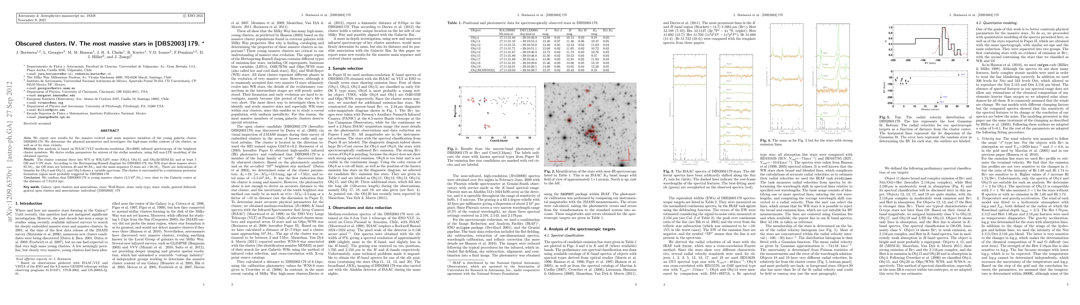Aims. We report new results for the massive evolved and main sequence members of the young galactic cluster DBS2003 179. We determine the physical parameters and investigate the high-mass stellar content of the cluster, as well as of its close vicinity. Methods. Our analysis is based on ISAAC/VLT moderate-resolution (R\approx4000) infrared spectroscopy of the brightest cluster members. We derive stellar parameters for sixteen of the stellar members, using full non-LTE modeling of the obtained spectra. Results. The cluster contains three late WN or WR/LBV stars (Obj 4, Obj 15, and Obj 20:MDM32) and at least 5 OIf and 5 OV stars. According to the Hertzsprung-Russell diagram for DBS2003 179, the WR stars show masses above 85Msun, the OIf stars are between 40 and 80Msun, and the main sequence O stars are >20Msun. There are indications of binarity for Obj 4 and Obj 11, and Obj 3 shows a variable spectrum. The cluster is surrounded by a continuous protostar formation region most probably triggered by DBS2003 179. Conclusions. We confirm that DBS2003 179 is young massive cluster (2.5 10^4Msun) very close to the Galactic center at the distance of 7.9+-0.8 kpc.