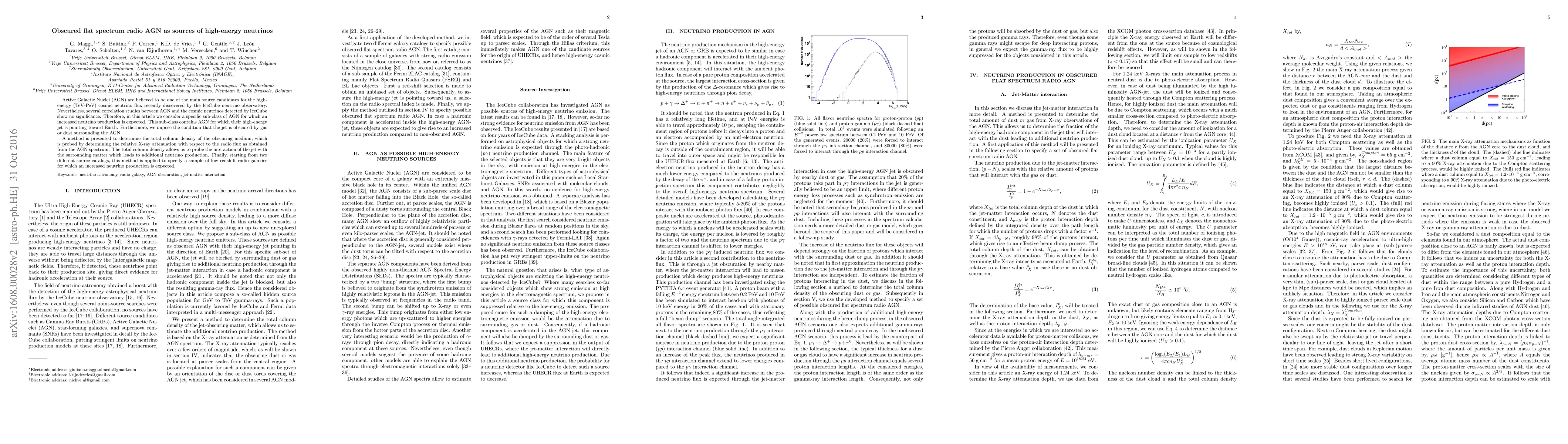 Active Galactic Nuclei (AGN) are believed to be one of the main source candidates for the high-energy (TeV-PeV) cosmic neutrino flux recently discovered by the IceCube neutrino observatory. Nevertheless, several correlation studies between AGN and the cosmic neutrinos detected by IceCube show no significance. Therefore, in this article we consider a specific sub-class of AGN for which an increased neutrino production is expected. This sub-class contains AGN for which their high-energy jet is pointing toward Earth. Furthermore, we impose the condition that the jet is obscured by gas or dust surrounding the AGN. A method is presented to determine the total column density of the obscuring medium, which is probed by determining the relative X-ray attenuation with respect to the radio flux as obtained from the AGN spectrum. The total column density allows us to probe the interaction of the jet with the surrounding matter which leads to additional neutrino production. Finally, starting from two different source catalogs, this method is applied to specify a sample of low redshift radio galaxies for which an increased neutrino production is expected.