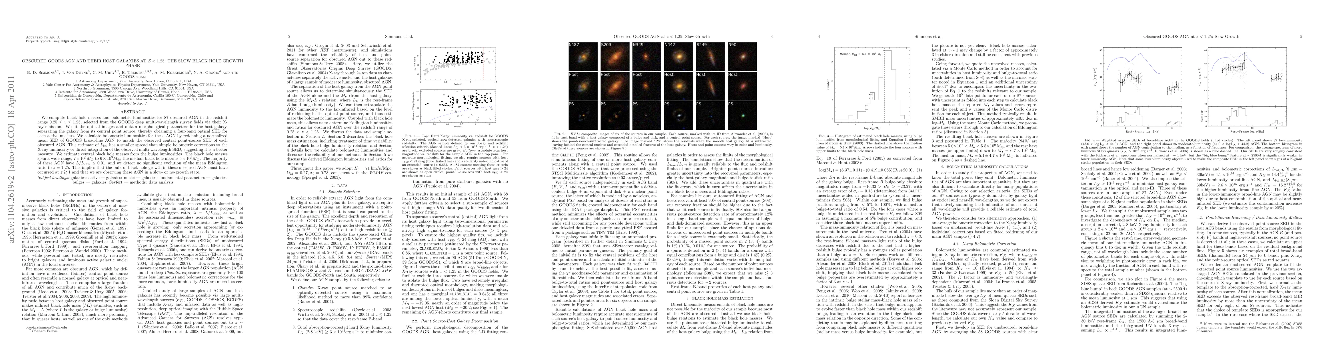 We compute black hole masses and bolometric luminosities for 87 obscured AGN in the redshift range 0.25 < z < 1.25, selected from the GOODS deep multi-wavelength survey fields via their X-ray emission. We fit the optical images and obtain morphological parameters for the host galaxy, separating the galaxy from its central point source, thereby obtaining a four-band optical SED for each active nucleus. We calculate bolometric luminosities for these AGN by reddening a normalized mean SED of GOODS broad-line AGN to match the observed central point-source SED of each obscured AGN. This estimate of Lbol has a smaller spread than simple bolometric corrections to the X-ray luminosity or direct integration of the observed multi-wavelength SED, suggesting it is a better measure. We estimate central black hole masses from the bulge luminosities. The black hole masses span a wide range, 7 x 10^6 M_sun to 6 x 10^9 M_sun; the median black hole mass is 5 x 10^8 M_sun. The majority of these AGN have L/L_Edd < 0.01, and we detect no significant evolution of the mean Eddington ratio to z = 1.25. This implies that the bulk of black hole growth in these obscured AGN must have occurred at z > 1 and that we are observing these AGN in a slow- or no-growth state.