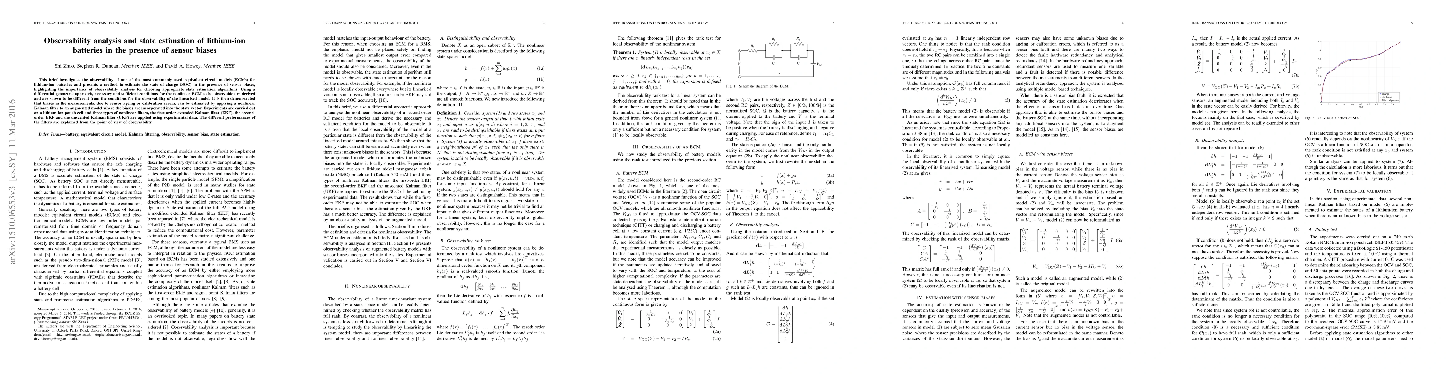 This paper derives observability conditions for a nonlinear ECM of lithium-ion batteries and proposes a method to estimate state of charge (SOC) while accounting for sensor biases, using a nonlinear Kalman filter on an augmented model. Experimental results show varying filter performance linked to the observability of the model.