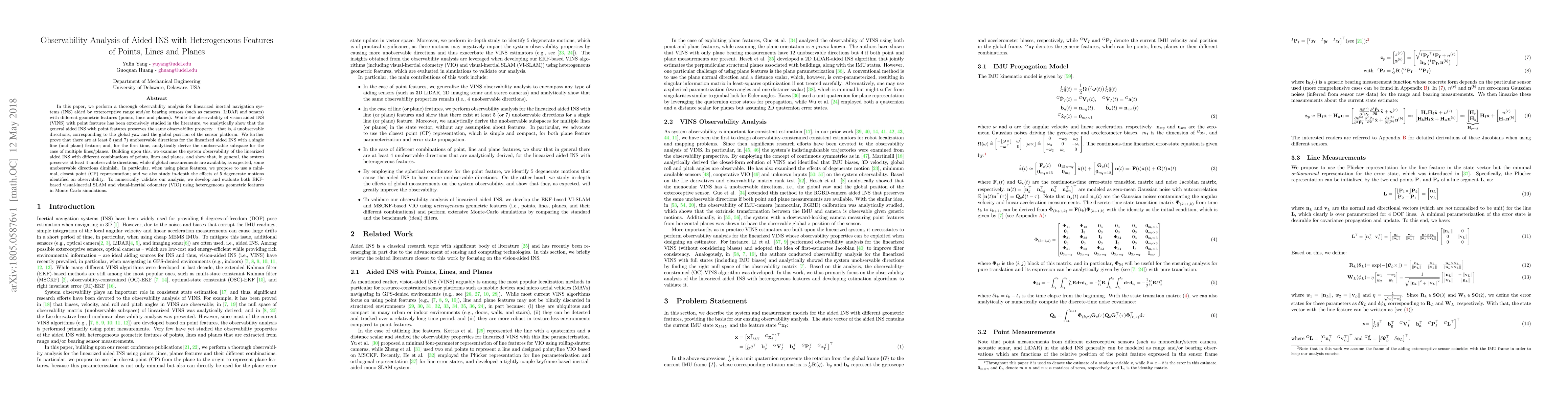 In this paper, we perform a thorough observability analysis for linearized inertial navigation systems (INS) aided by exteroceptive range and/or bearing sensors (such as cameras, LiDAR and sonars) with different geometric features (points, lines and planes). While the observability of vision-aided INS (VINS) with point features has been extensively studied in the literature, we analytically show that the general aided INS with point features preserves the same observability property: that is, 4 unobservable directions, corresponding to the global yaw and the global position of the sensor platform. We further prove that there are at least 5 (and 7) unobservable directions for the linearized aided INS with a single line (and plane) feature; and, for the first time, analytically derive the unobservable subspace for the case of multiple lines/planes. Building upon this, we examine the system observability of the linearized aided INS with different combinations of points, lines and planes, and show that, in general, the system preserves at least 4 unobservable directions, while if global measurements are available, as expected, some unobservable directions diminish. In particular, when using plane features, we propose to use a minimal, closest point (CP) representation; and we also study in-depth the effects of 5 degenerate motions identified on observability. To numerically validate our analysis, we develop and evaluate both EKF-based visual-inertial SLAM and visual-inertial odometry (VIO) using heterogeneous geometric features in Monte Carlo simulations.