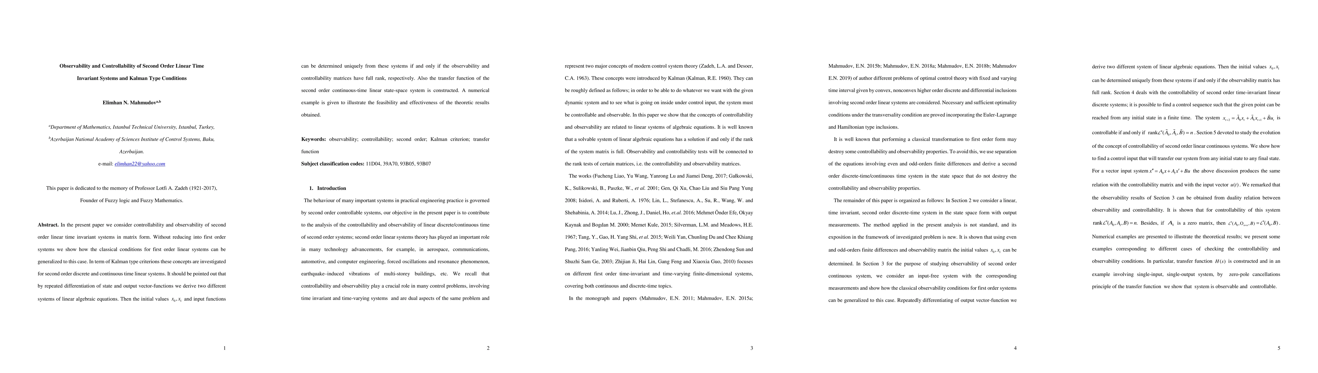 This paper investigates the controllability and observability of second-order linear time-invariant systems without reducing them to first-order systems. It generalizes classical conditions from first-order systems and applies Kalman type criteria to both discrete and continuous time systems, showing that full rank observability and controllability matrices ensure unique determination of initial values and input functions.