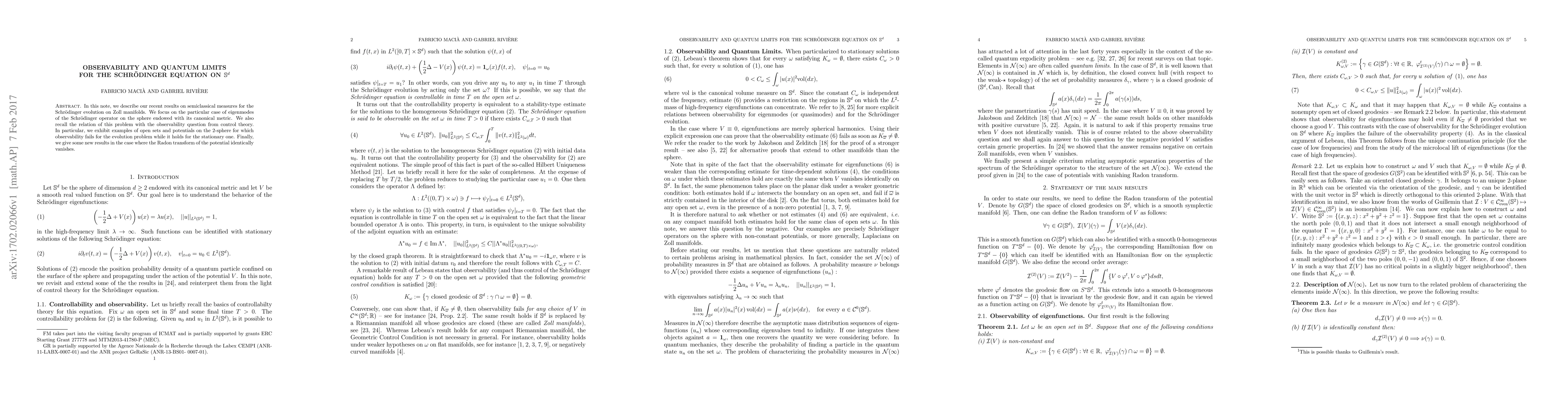 In this note, we describe our recent results on semiclassical measures for the Schr{\"o}dinger evolution on Zoll manifolds. We focus on the particular case of eigenmodes of the Schr{\"o}dinger operator on the sphere endowed with its canonical metric. We also recall the relation of this problem with the observability question from control theory. In particular, we exhibit examples of open sets and potentials on the 2-sphere for which observability fails for the evolution problem while it holds for the stationary one. Finally, we give some new results in the case where the Radon transform of the potential identically vanishes.