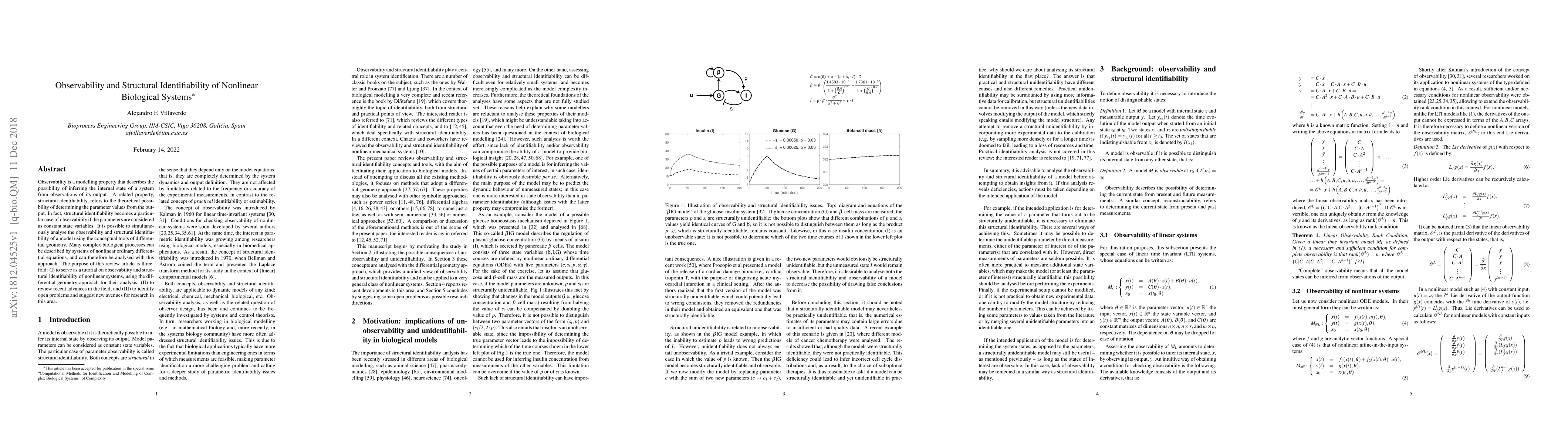 This paper reviews the concepts of observability and structural identifiability in nonlinear biological systems, employing differential geometry for analysis. It aims to provide a tutorial on these topics, summarize recent advances, and propose new research directions.