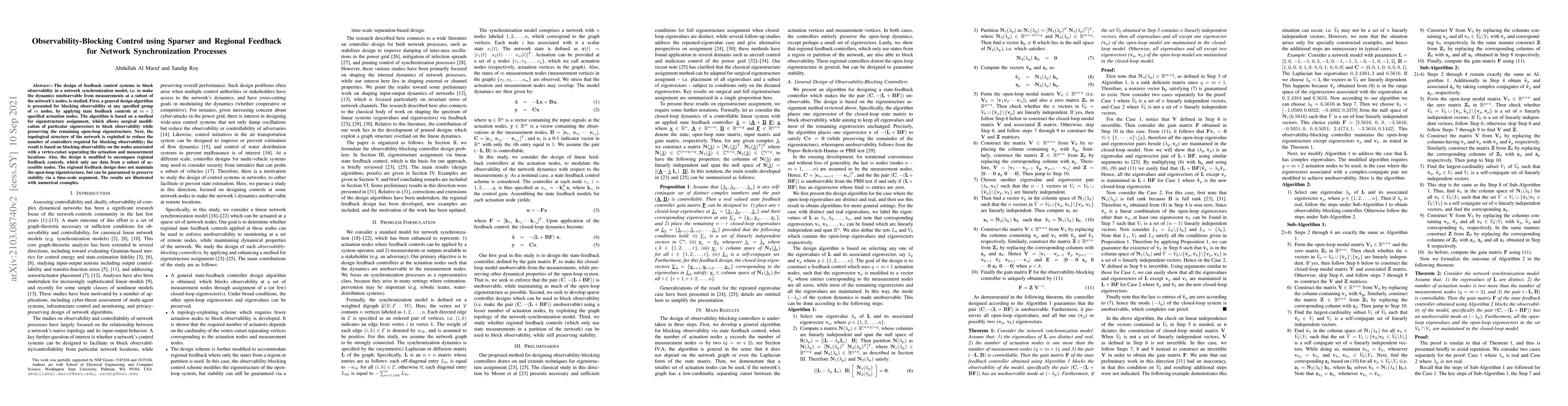This paper presents an algorithm for designing feedback control systems to block observability in network synchronization models, focusing on reducing the number of control nodes and employing regional feedback. The method modifies the system's eigenstructure to prevent observability at specified nodes while maintaining stability.