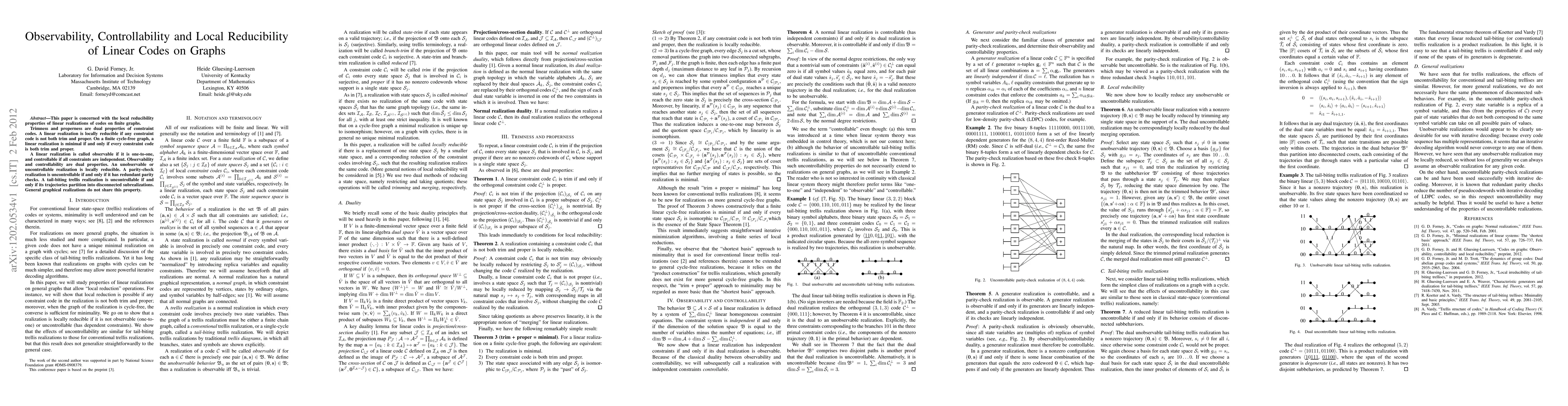 This paper is concerned with the local reducibility properties of linear realizations of codes on finite graphs. Trimness and properness are dual properties of constraint codes. A linear realization is locally reducible if any constraint code is not both trim and proper. On a finite cycle-free graph, a linear realization is minimal if and only if every constraint code is both trim and proper. A linear realization is called observable if it is one-to-one, and controllable if all constraints are independent. Observability and controllability are dual properties. An unobservable or uncontrollable realization is locally reducible. A parity-check realization is uncontrollable if and only if it has redundant parity checks. A tail-biting trellis realization is uncontrollable if and only if its trajectories partition into disconnected subrealizations. General graphical realizations do not share this property.